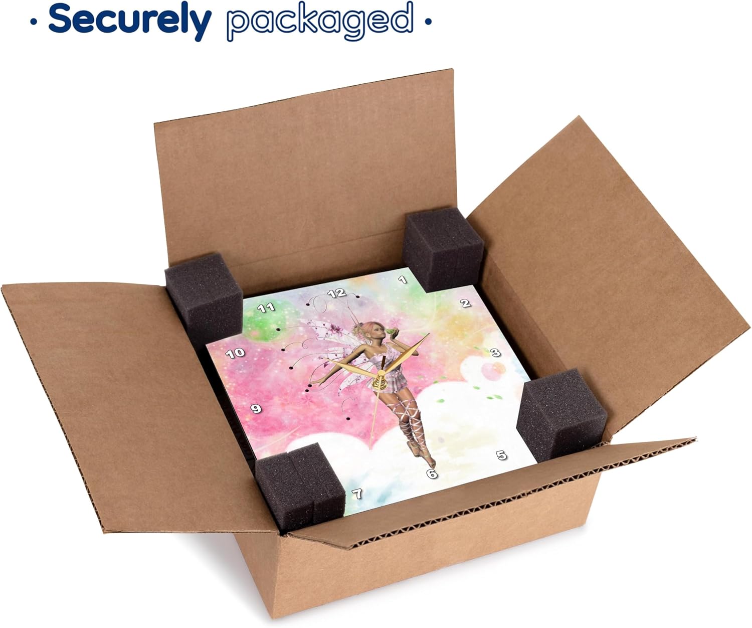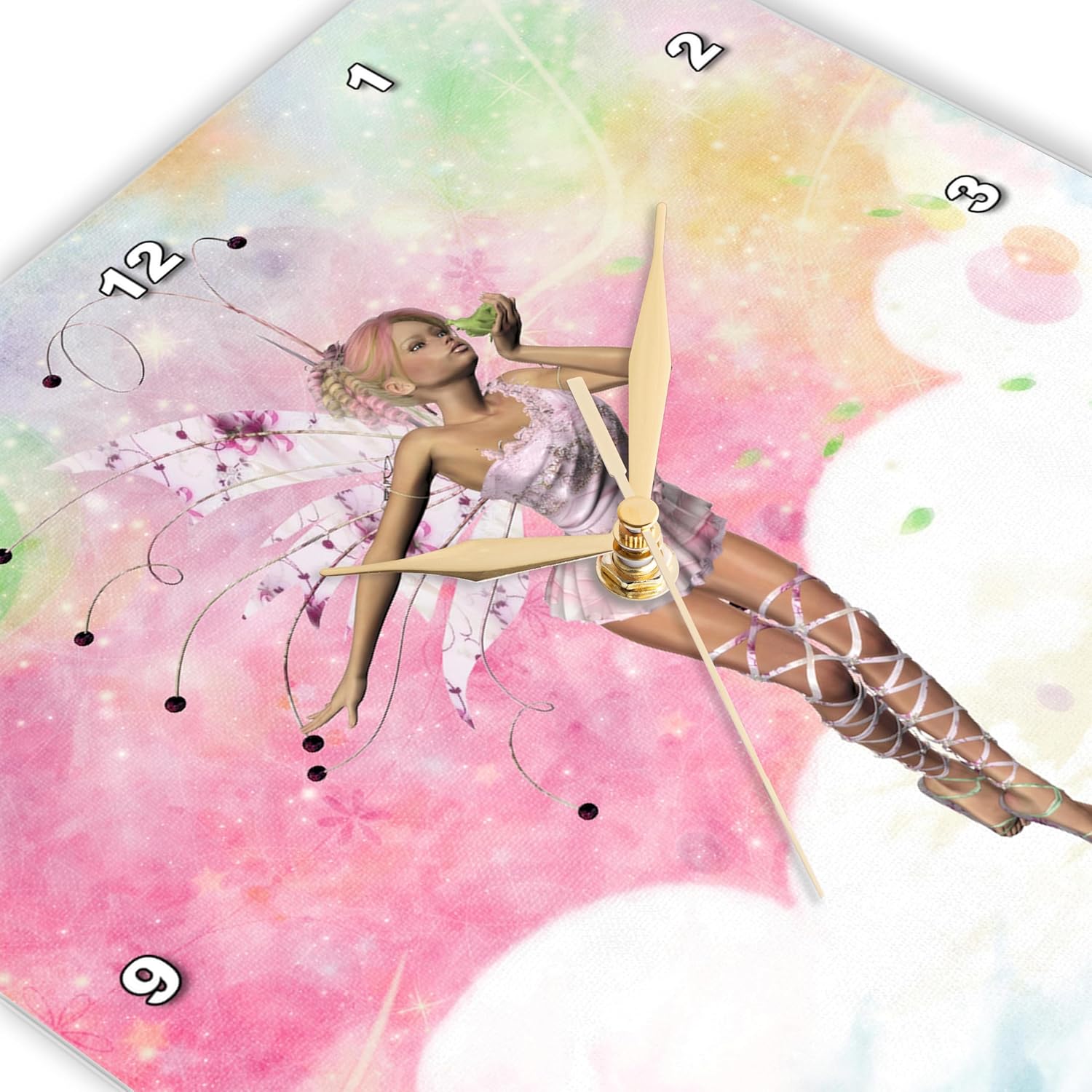 A little fairy Kiss a magic Frog on a pink background wall clock is a wonderful complement to any room in your home or office. Made of durable high grade aluminum. This frameless clock has a high gloss mirror like, UV coated, scratch resistant finish and is suitable for a moist environment. Sizes available range from 10x 10to 15x 15. Requires one AA battery; not included. Battery box is not covered.