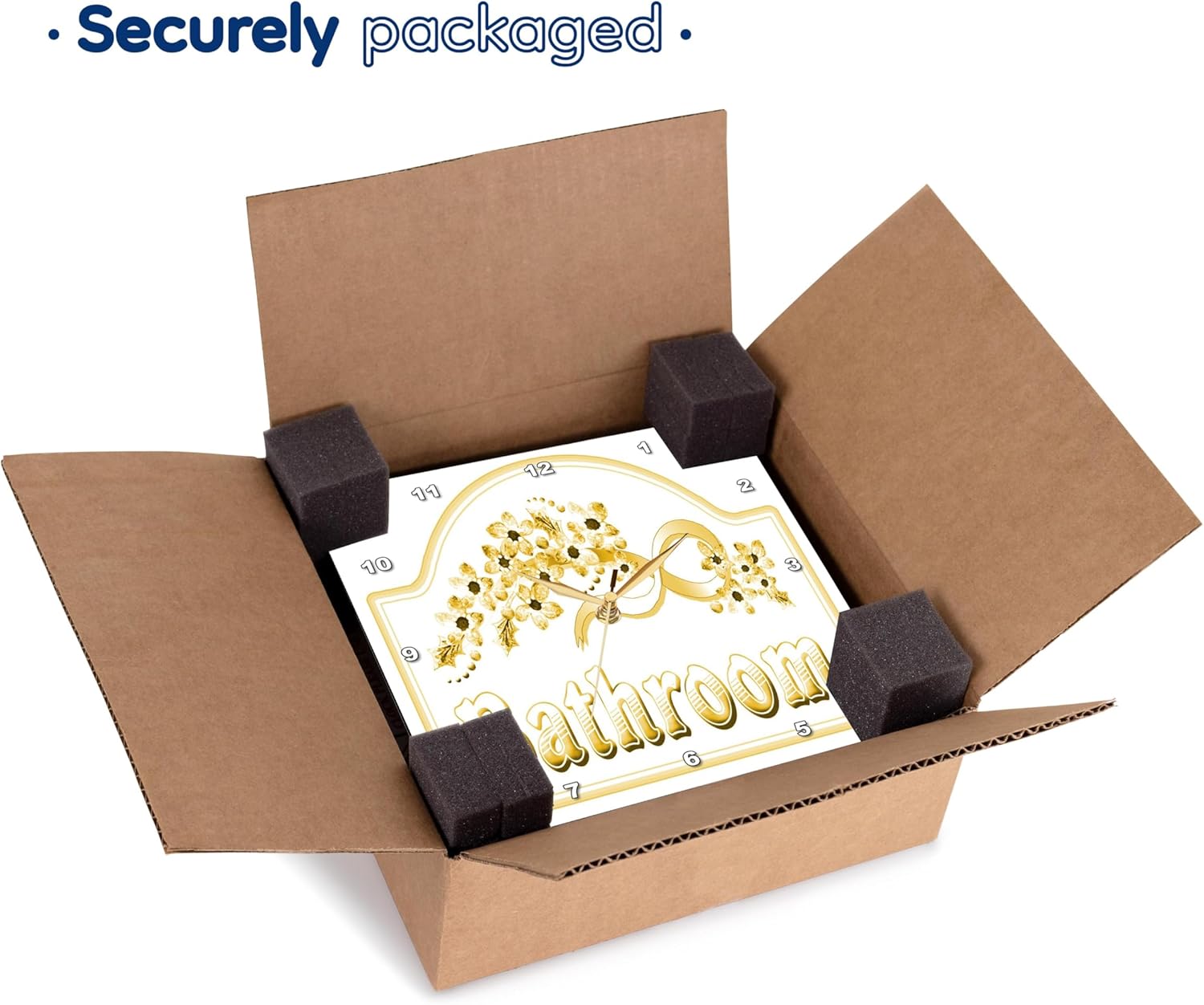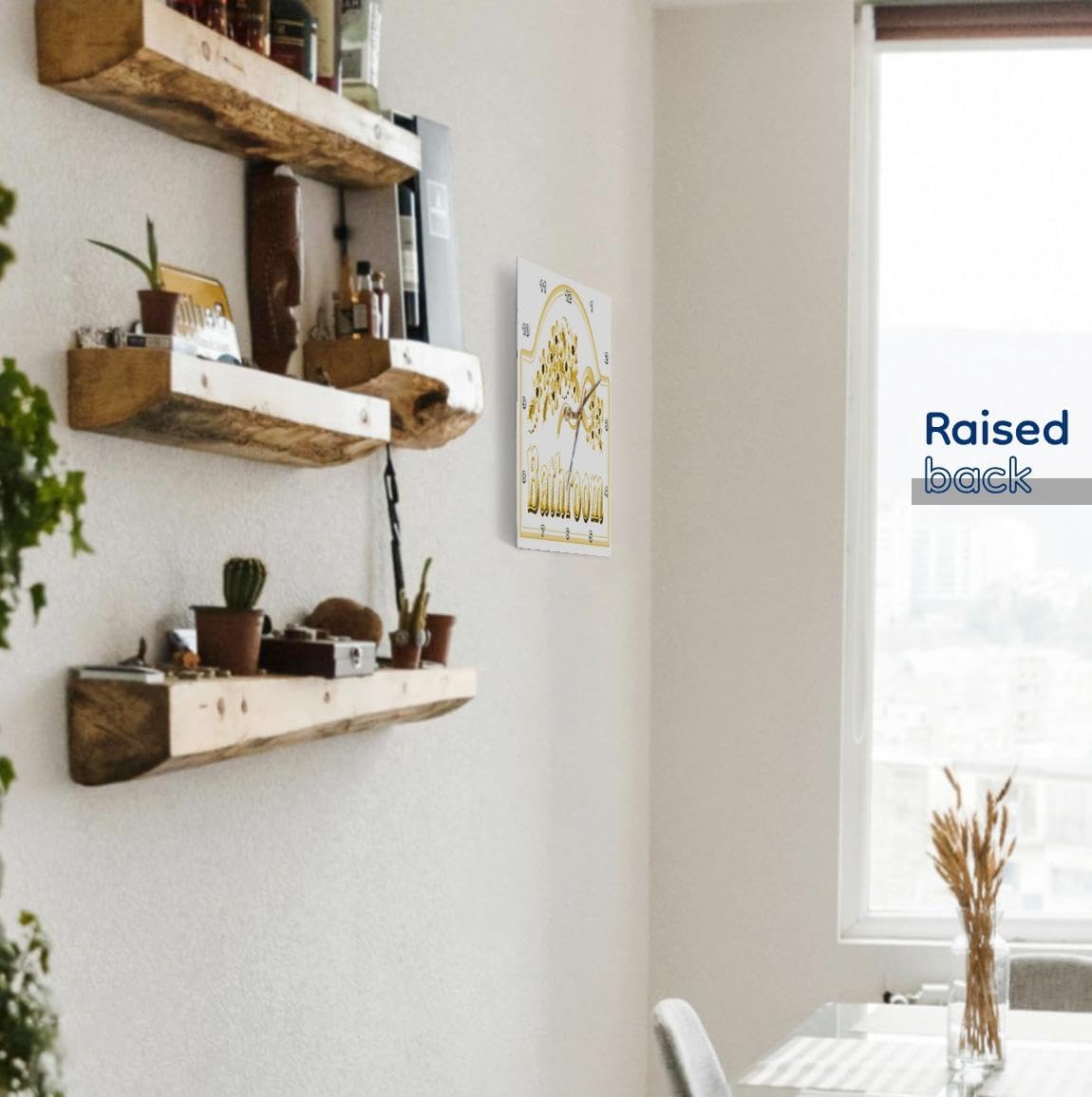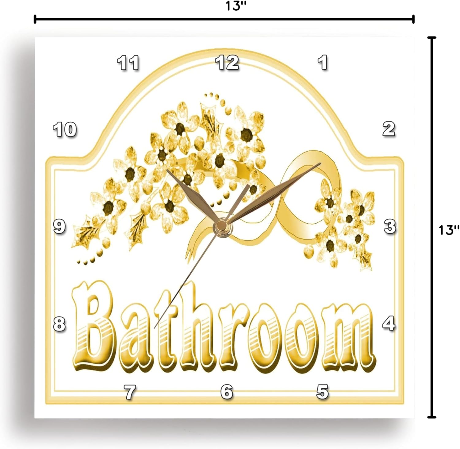 Victorian Yellow Gold Bathroom Sign Wall Clock is a wonderful compliment to any room in your home or office. Made of durable high grade aluminum. This clock has a high gloss mirror like, UV coated, scratch resistant finish and is suitable for a moist environment. Available in multiple sizes, requires one AA battery; not included. Battery box is not covered.