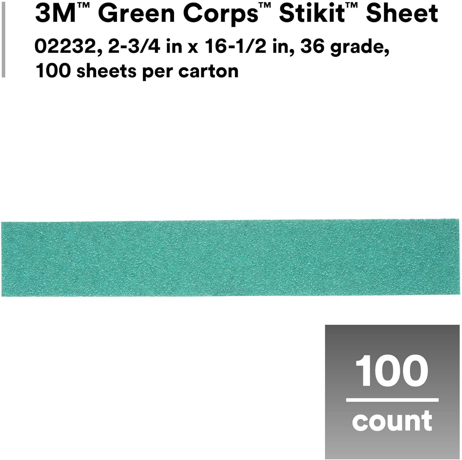 | Item Type Name | 3M Green Corps Stikit Production Sheet, 02232, 2 3/4 in x 16 1/2 in, 36 grade, 100 sheets per carton |