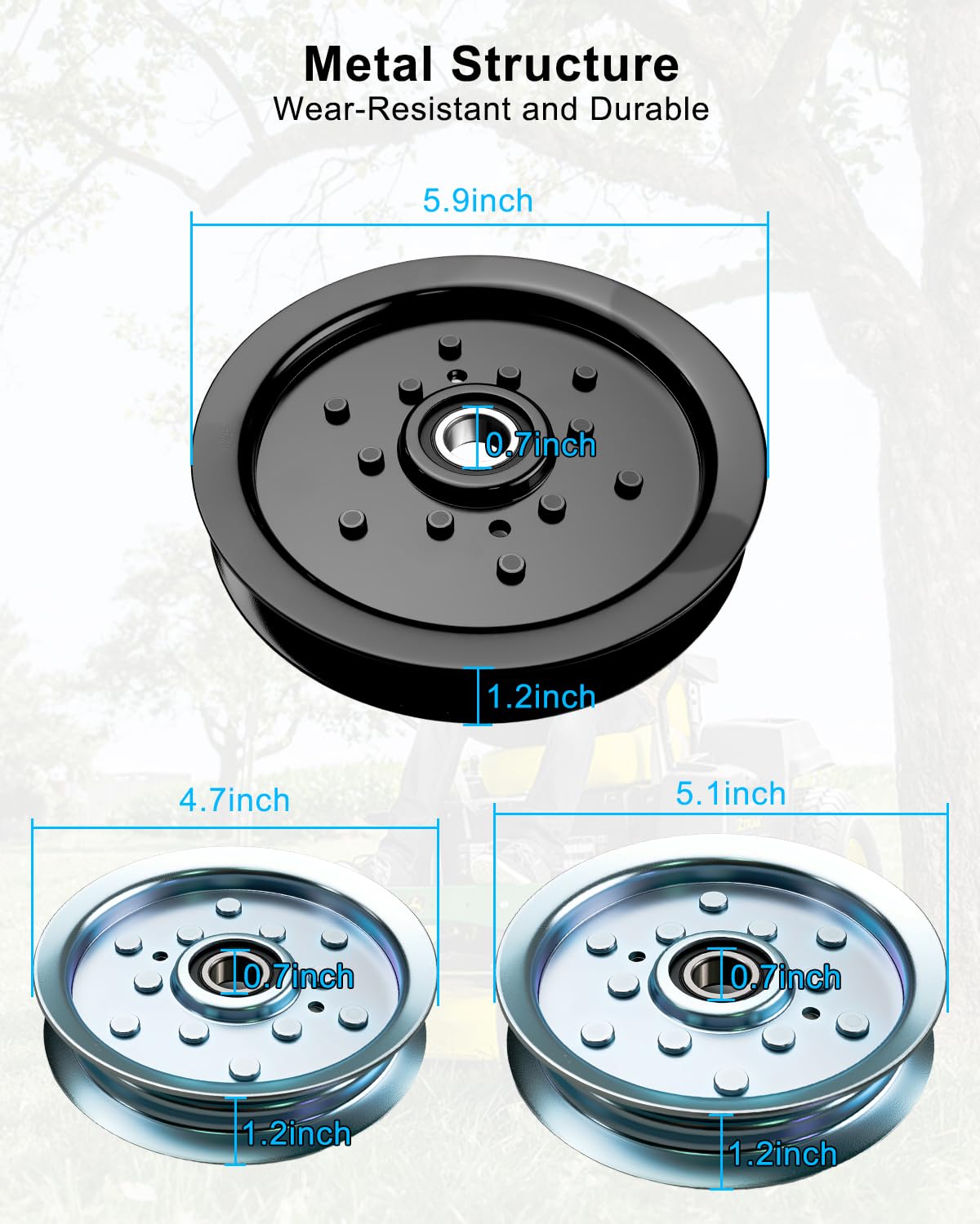 Lawn Mower Flat Idler Pulley ▪ Strong and Durable ▪ Efficient Mowing Compatible Models: Fit for John Deere Zero-Turn Lawn Mower Fit for John Deere Z245 EZtrak Residential 48" Zero Turn Mower (Worldwide Edition) Fit for John Deere Z255 EZTRAK 48" Mower Fit for John Deere Z355E ZTRAK 48" Mower Fit for John Deere Z425 EZtrak Residential 48" & 54" Zero Turn Mower (Worldwide Edition) Fit for John Deere Z435 EZtrak Residential 48" & 54" Zero Turn Mower (Worldwide Edition) Fit for John Deere Z445 EZtrak Residential 48" & 54" Zero Turn Mower (Worldwide Edition) Fit for John Deere Z465 EZtrak Residential 48" Zero Turn Mower (Worldwide Edition) Fit for John Deere Z645 EZtrak 48" Mower (Worldwide Edition) Fit for John Deere 625 EZtrak Residential 54" Zero Turn Mower (Worldwide Edition) Fit for John Deere Z655 EZtrak 54" Mower (Worldwide Edition) Fit for John Deere Z665 EZtrak 60" Mower Replacement Part Number: Replace AM135526 AM128118 AM143737 AM136693 Item Size: Replace AM128118 Pulley Size: Width: 1.2", OD: 4.7", ID: 0.7" Replace AM135526 Pulley Size: Width: 1.2", OD: 5.1", ID: 0.7" Replace AM143737 Pulley Size: Width: 0.9", OD: 5.9", ID: 0.7" You Will Get: 3 x Flat Idler Pulleys Lawn Mower Deck Pulley: 1) Pulleys guide the belt, preventing slippage and ensuring efficient power transmission 2) Enables the lawnmower to adapt to various terrains and different lawns 3) Reduces vibration and friction, minimizing noise 4) Constructed with high-quality materials for durability and robustness 5) Easy to install, plug and play