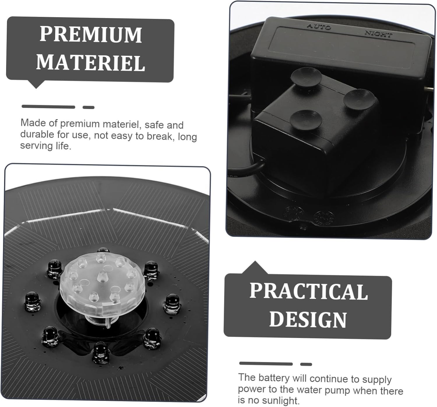 Package List 1 Characteristics - height: 0.7m solar powered fountain pump. - Color: Black garden water pump. - Battery capacity: 800mAh solar water pump. - Size: 16.00X16.00X3.50cm/6.29X6.29X1.38in solar fountain pump - Material: ABS bath pump. - Solar power: 3W pond bath pump. - Light color: Colorful garden fountain pump. - Water pump power: 1W pond solar pump. - Made of material, and for use, not easy to break, long serving life pool solar pump. - The fountain is equipped with 12 small colored LED bulbs, which can be lit at night after the night mode is activated. You can also see beautiful scenery in the dark night solar pump. - The height can be adjusted by changing nozzles to avoid spilling out of the basin. You can easily change the head outdoor solar fountain pump. - With built in 800mAh battery, can make up for the insufficient power supply of solar panels in the case of weak sunlight water fountain pump. - The battery will continue to supply power to the water pump when there is no sunlight solar fountain water pump.Goods Description bath solar pump Ensure more stable water output and higher water height, let your fountain look more beautiful and eye-catching.outdoor solar fountain pump This solar floating fountain water pump is equipped with a 3W solar panel, it allows the water pump to work continuously, even when the sunlight is weak