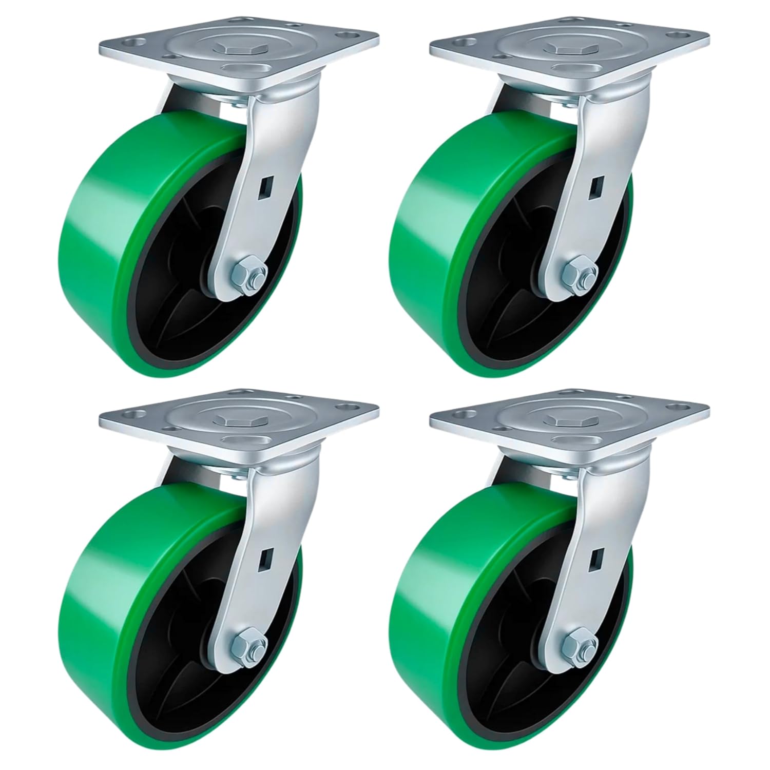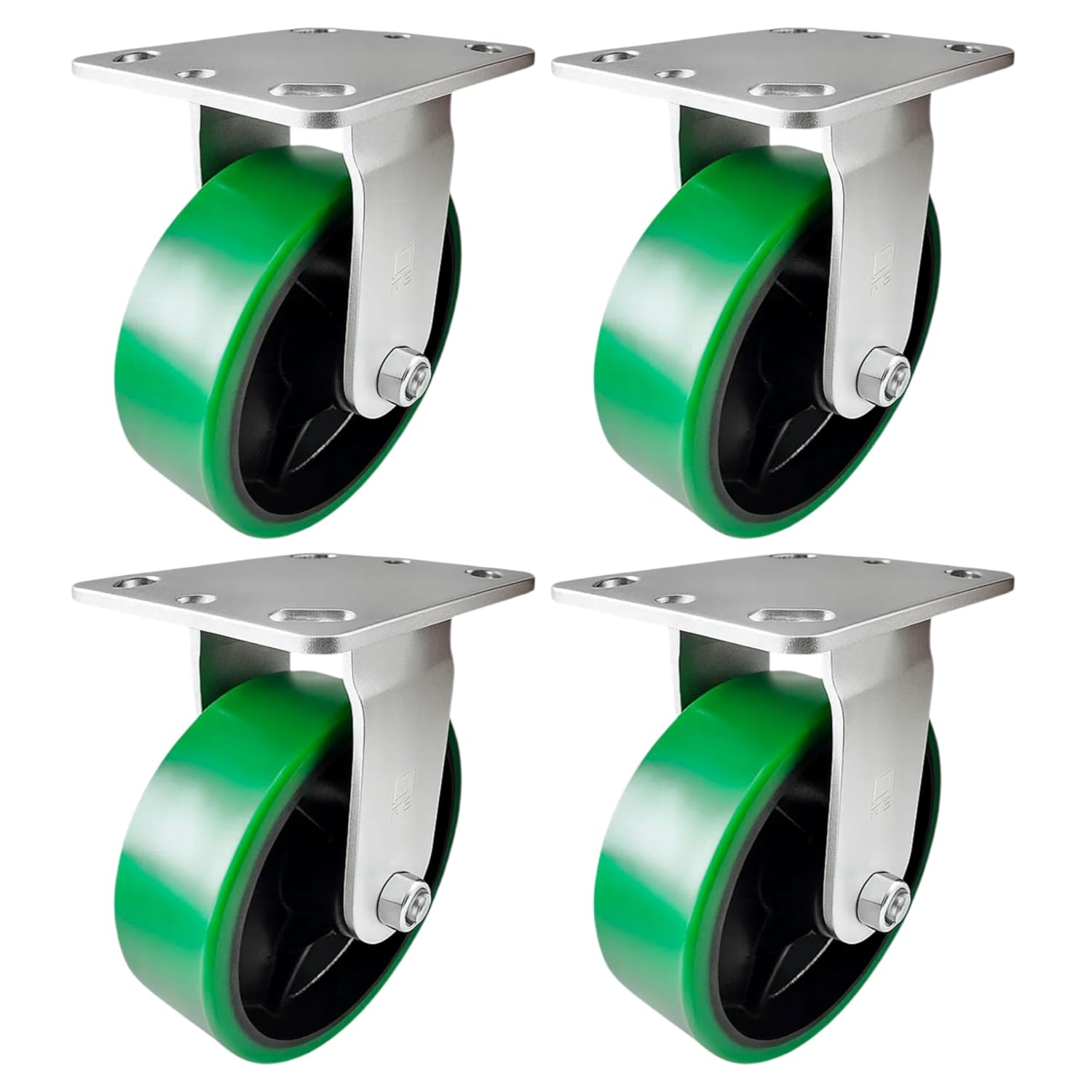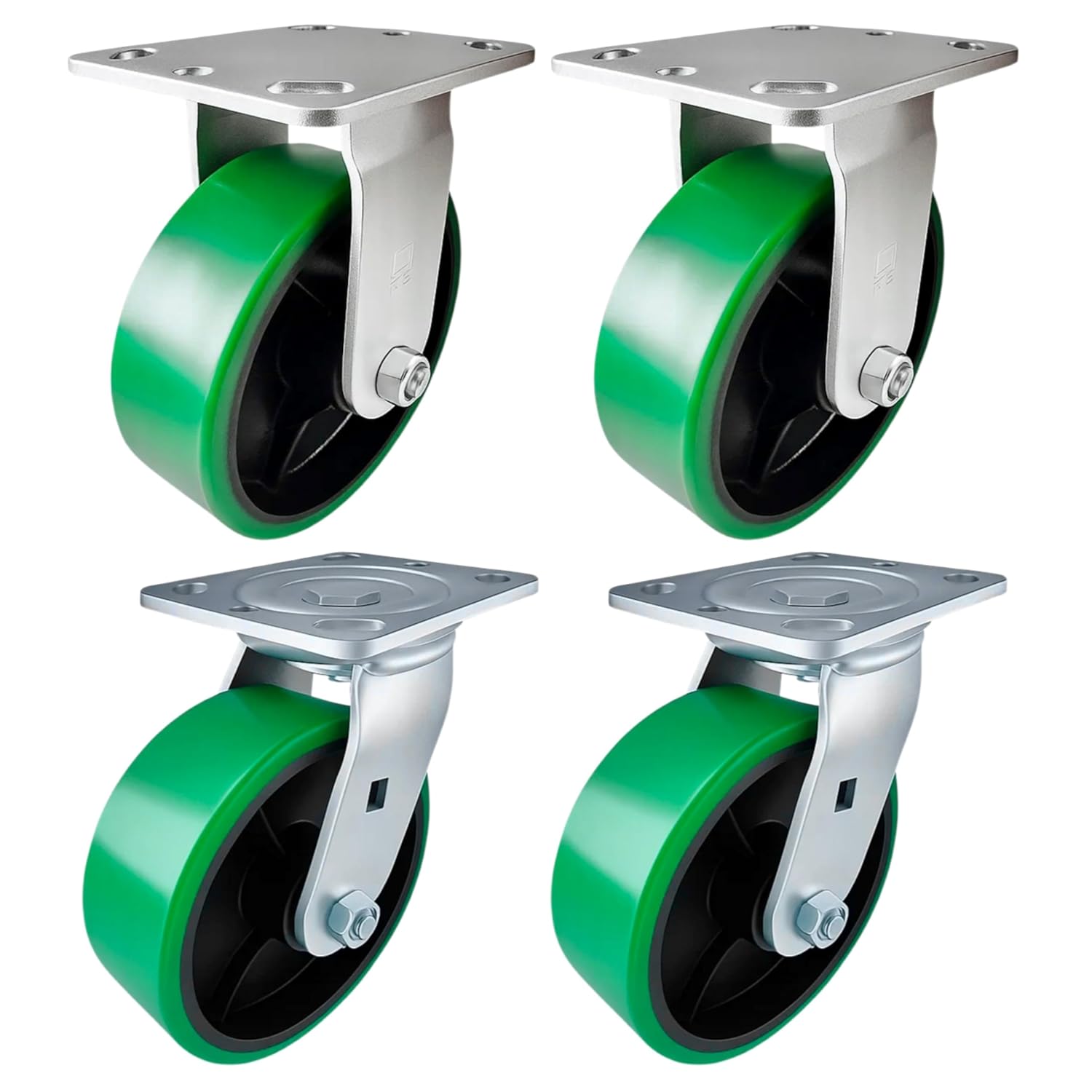 Enhance the mobility and stability of your furniture, workbench, carts, or toolbox with our Heavy Duty Caster Set featuring polyurethane on cast iron wheels in vibrant green, designed to leave no marks behind. With versatile set options including 4 Rigid, 4 Swivel, 4 Swivel with Brake, 2 Rigid + 2 Swivel, 2 Rigid + 2 Swivel with Brake, and 2 Swivel + 2 Swivel with Brake, you can choose the configuration that best suits your needs. Available in 4", 5", and 6" diameter options, these casters offer varying load capacities ranging from 700 pounds to 1000 pounds per caster, ensuring reliable support for medium-heavy duty applications. The tread width of 2" provides a stable base for smooth and effortless movement, while the top plate measuring 3-15/16" x 4-1/2" offers easy installation and compatibility with different mounting configurations. Whether you're maneuvering platform trucks, food service equipment, or large stock carts, our caster set is an excellent choice for a wide range of applications.