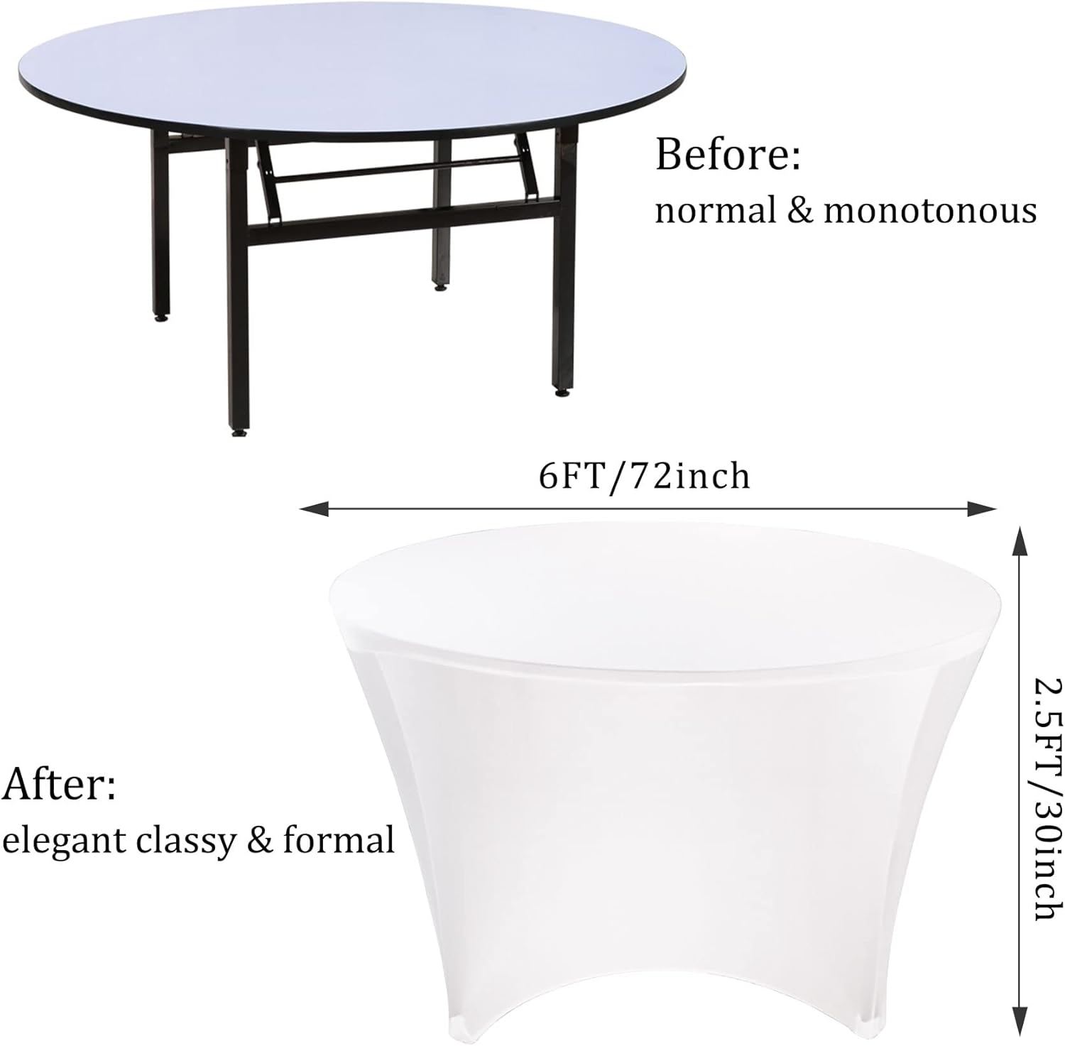 Round Spandex Table Cover Features: √ Great product with four-way high quality spandex fabric, simple and classy, it can be used in all seasons. This round spandex tablecloth is the best choice for parties, weddings, buffet, banquets, hotel reception, exhibition display, etc. Compared with traditional tablecloths, the table cover looks more natural, elegant and modernize. √These round spandex table cover are fantastic! No wrinkles, easy to stall and clean, look terrific! It is washable and reusable, and can serve you for a long time. Beautiful pop of color make everything around luxurious. Please don’t miss √These round table cover will change the look of your balcony, banquet, party, bar, birthdays, wedding. This is what you are hoping for! They can fit snugly and look great, and service you for a long time. Specifications: Size: 72Inch/6FT Color: White Material: 90% polyester 10% spandex Quantity: 4 Pieces Package Includes: 4 Pcs Round Spandex Tablecloths Kindly Notes: 1. Don’t bleach and twist it, and please don’t dry it in direct sunshine, or it maybe will fade. 2. Please allow slight dimension differences due to different manual measurement. 3. The color may exist a slight difference due to different screen displays, thanks for your understanding. 4. The item of spandex tablecloth is not included any other products. Please make sure that your table size within the range before you order, thanks for your understanding! Our Service: If you have any questions, please feel free to contact us by email, we will try our best to solve it for you within 24 hours, your satisfaction, our pursuit, thank you~