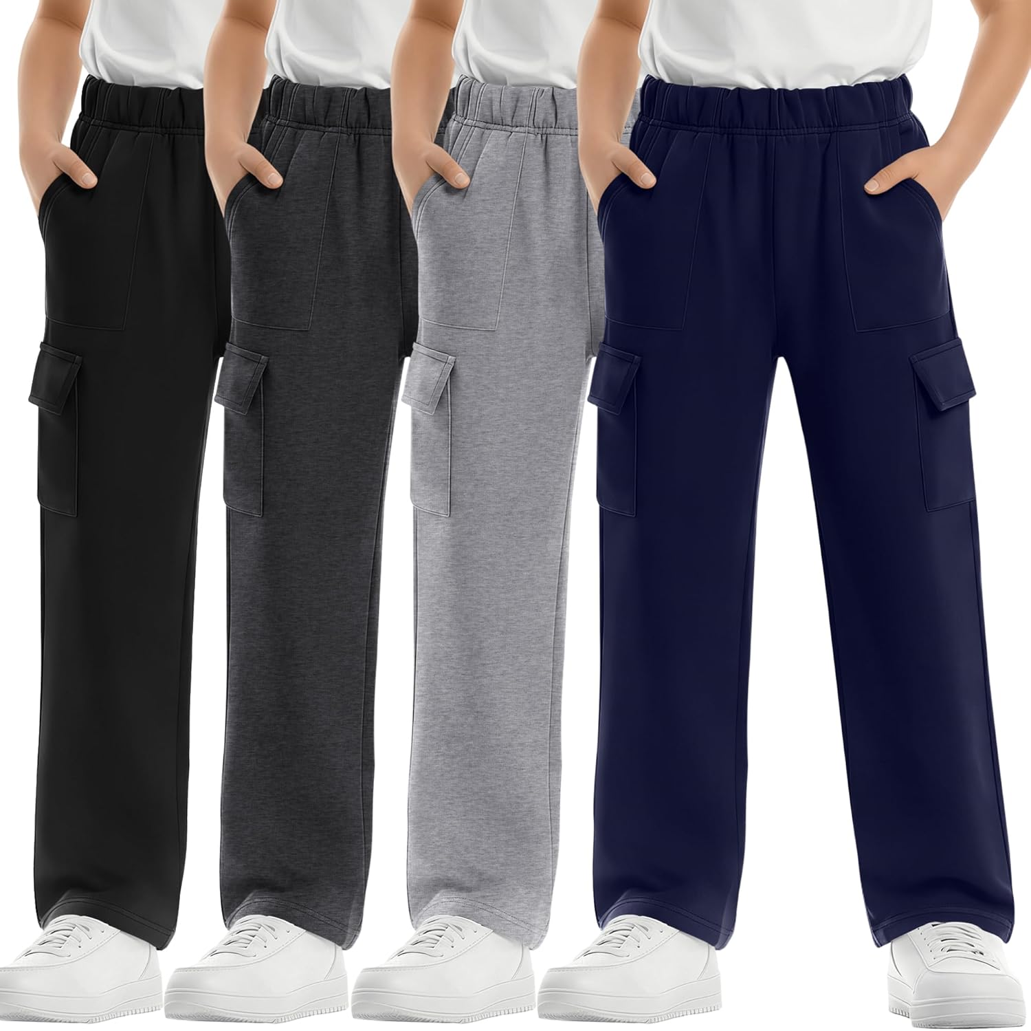 Features: Solid Color Style: The boy's elastic waist sweatpants are a classic solid color design that is both casual and practical, making it a proper choice for everyday wear. Easy Clean: Machine or hand washable, hang or line dry, no bleach, no dry clean, iron on low heat. Specifications: Material: 95% Polyester, 5% Rayon Package Includes: 4 x Boy's cargo wide leg pants Notes: Manual measurement, please allow slight errors on size. The color may exist a slight difference due to different screen displays