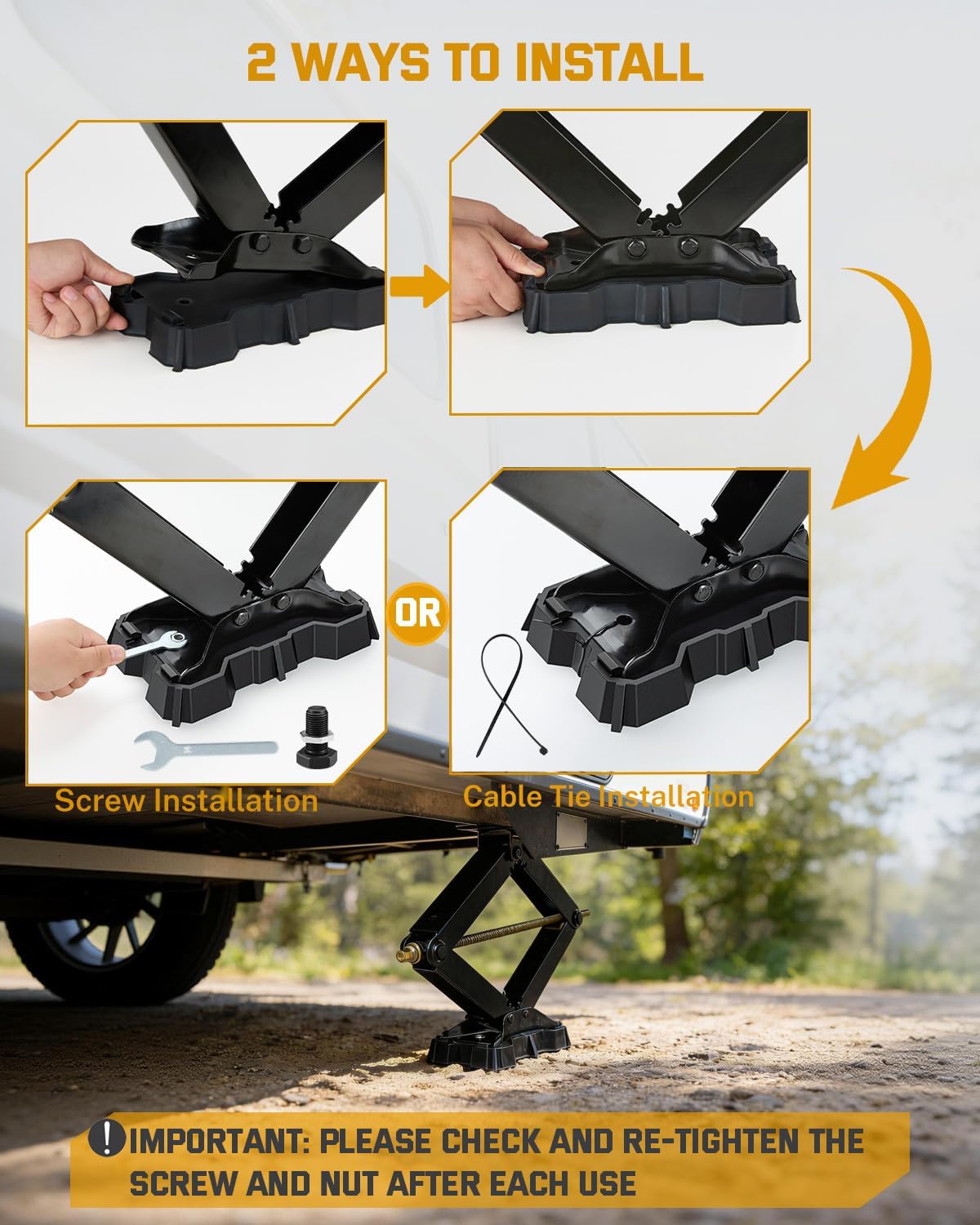 • Tool-Free Installation – Fits securely onto the bottom of your existing scissor jack in about 20 seconds—no disassembly required. Easy to attach, remove, or replace. Includes both cable ties and screws for added reinforcement, keeping the pad firmly in place even while the RV is in motion.
