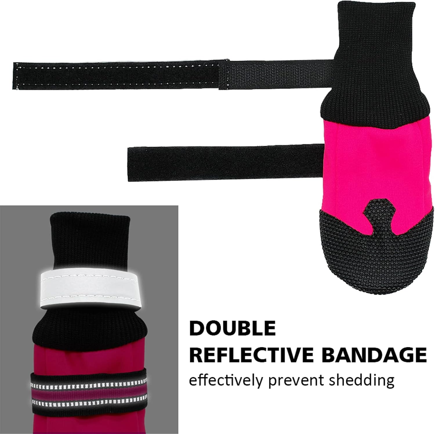 WHY CHOOSE US?We always think that Pets are human beings' most loyal friends. We need to give our pets the same care as our loved ones.FEATURESWaterproof fabricThe rubber sole The adjustable hook & Loopreflective strap allows you to see your dog at night.HOW TO MEASURE?1. Place the dogโs paw on the paper and press it down on the top to imitate your dogโs paw shape when walking.2. Mark the width of all 4 paws.3. Record the widest dimensions.4. Refer to the size chart and choose the suitable size.(Please choose a larger one for your pets' comfortable wear)PARAMETER:Material: A + A Material + Cotton Lining + Rubber SoleBreed: Medium & Large dogsSize: S: 6.0(L)*5.0(W)cmM: 6.5*5.5cmL: 7.0*6.5cmXL: 8.0*7.0cmXXL: 9.5*8.0cmPACKAGE4 x pet shoesNOTICEManual Measurement, please allow slightly errors