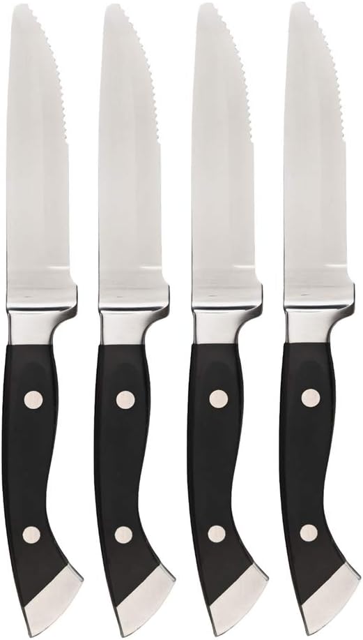 Set of 4 Longhorn Steakhouse steak knives. High quality carbon steel, serrated blade. Same model, same manufacturer as commercial Longhorn Steakhouse knives, but without the logo on the blade (no logo). Heavy, nicely balanced knives weigh 7oz. each, are 10.5" long with a 5" long blade. Put these great steak knives right into the dishwasher and they look like new, wash after wash. Make short work of cutting up any chop or steak in style!
