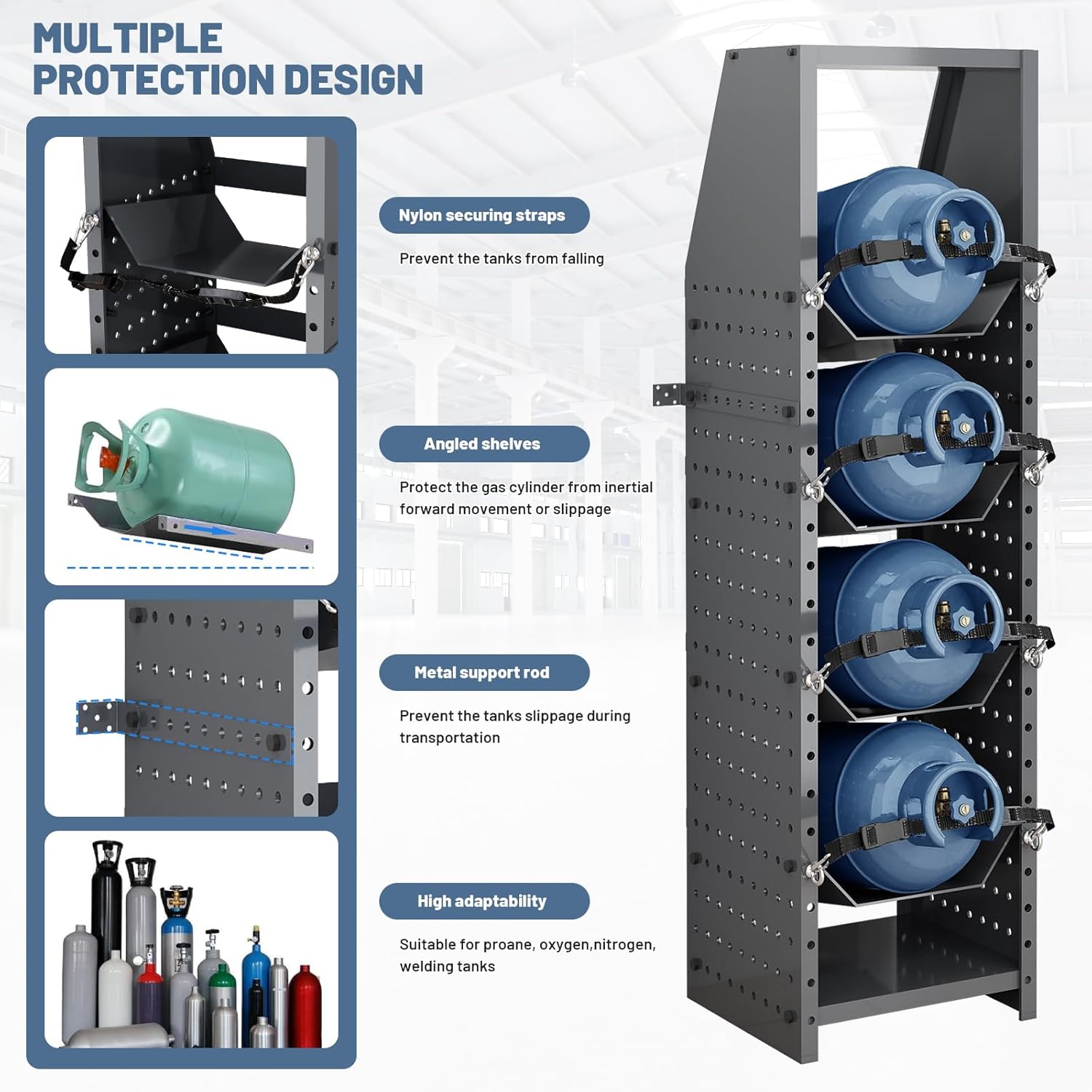 Exerock 4-Tier Heavy-Duty Storage Rack: Organize Your Workshop and VehicleTired of cluttered gas cylinders in your garage or cargo van? The Exerock 4-Tier Storage Rack brings order and safety to your space. This robust solution securely holds oxygen, propane, refrigerant, and nitrogen tanks with unmatched stability.Commercial-Grade StrengthBuilt from high-grade steel, this rack withstands tough environments. Reinforced shelves and robust welding prevent bending and warping, offering reliable performance for years.Space-Saving Vertical DesignPerfect for tight spaces, this refrigerant tank rack organizes up to four tanks vertically. Free up floor space in your garage or van. This oxygen storage rack creates a safer, professional workspace.Versatile and Secure StorageUse as a dependable oxygen tank holder for welding or sturdy propane tank storage for grilling. The integrated pallet design prevents shifting during transport.Safety First DesignOpen-sided design allows easy access while raised edges keep tanks secure. This stable propane tank storage solution prevents tipping accidents.Quick Assembly and Multiple UsesAssemble in minutes with included hardware. Beyond tanks, store tools, supplies, or pipes. Essential for HVAC techs, welders, contractors, and DIYers.Order now and transform your space with Exerock!