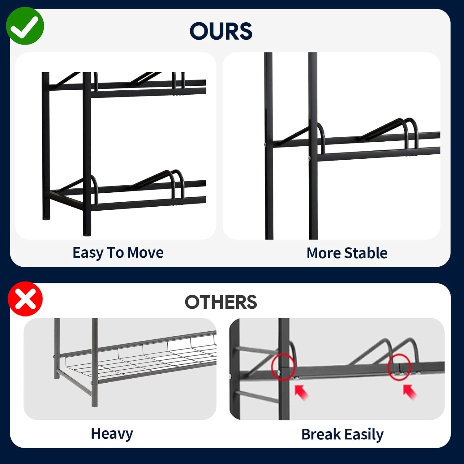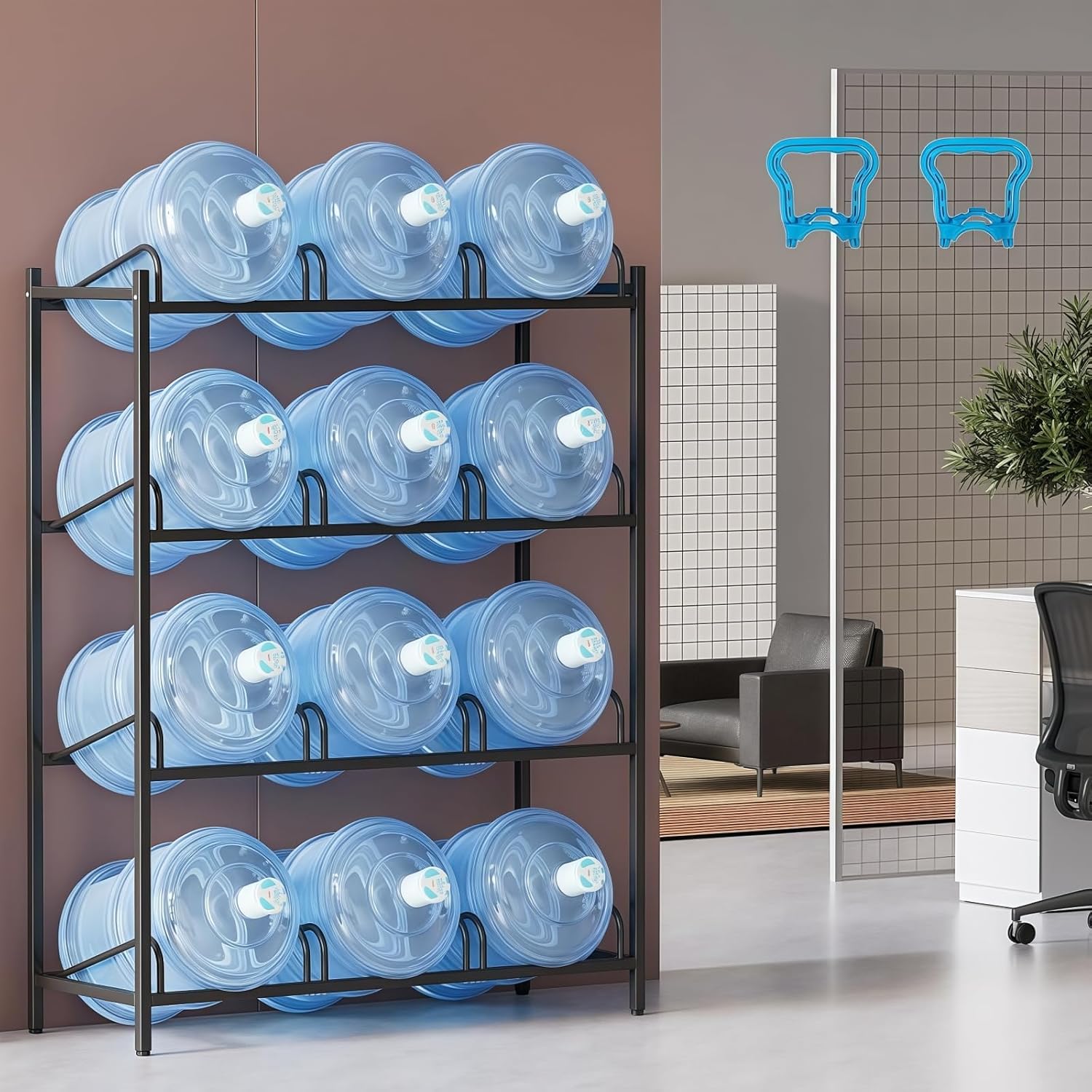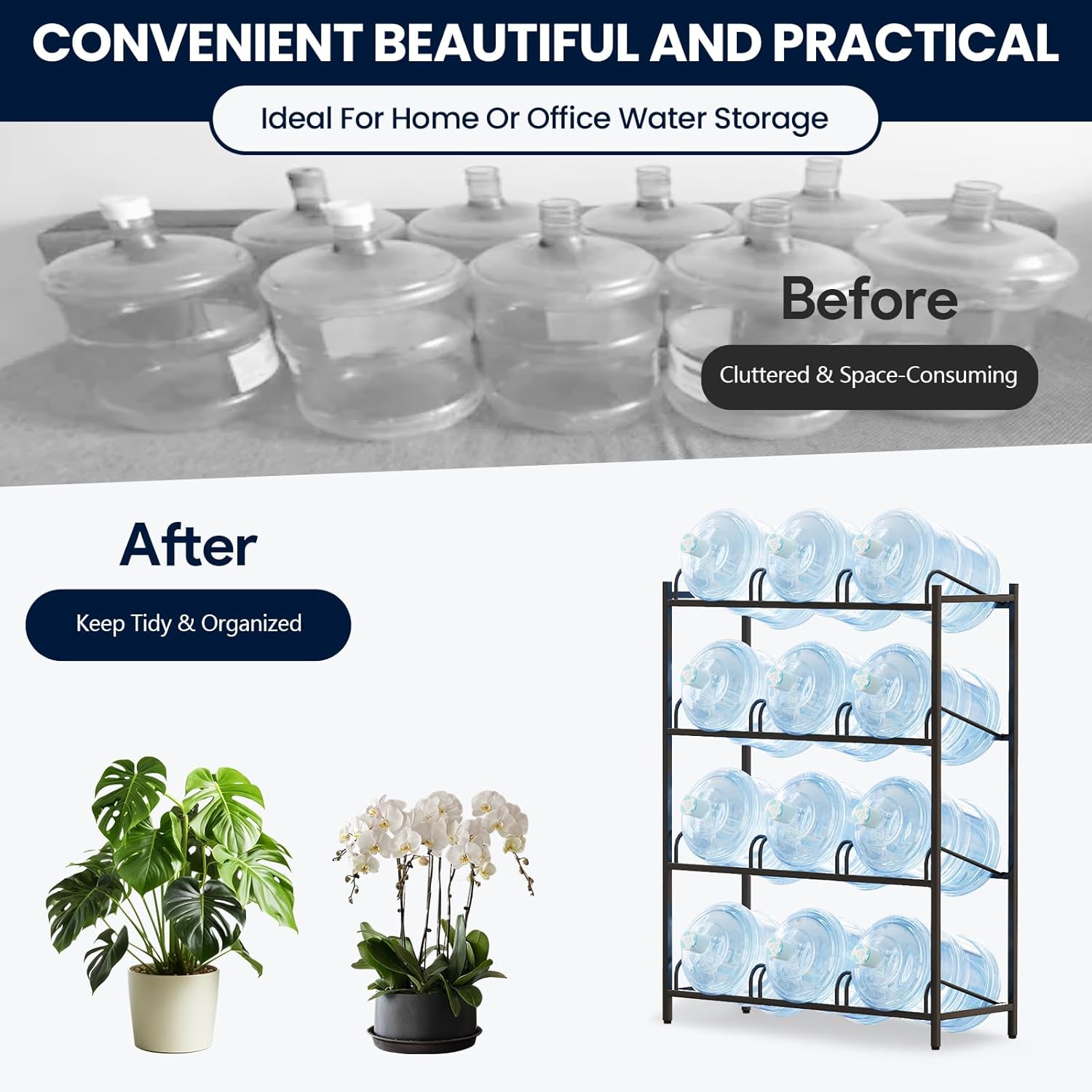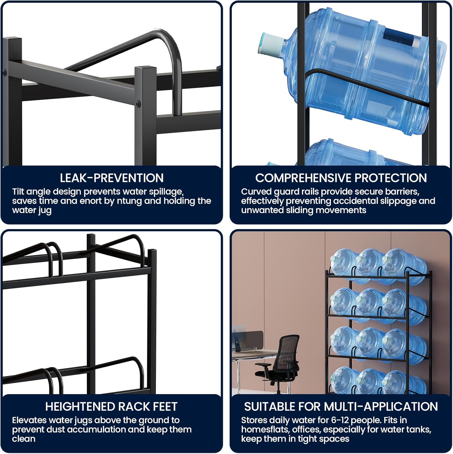 Why Choose Our Water Jug Rack?Engineered for heavy-duty water storage in compact spaces, this reinforced steel rack system delivers industrial-strength capacity with innovative leak-prevention design for homes, offices, and commercial spaces.Key Features:Strong Load-Bearing - Holds twelve 3-5 gallon water bottles (500+ lbs capacity) with thickened steel pipe constructionLeak-Prevent Design - Inclined trays with curved metal cradles keep spouts elevated to prevent spillsAnti-Rolling Guardrail - Front and side barriers prevent bottle slippage during useCorrosion-Resistant - Reinforced carbon steel with black baked paint for durabilityEasy Assembly - One-piece bent steel components assemble in 10 minutes without toolsWhy It's Essential:Maximizes vertical storage in tight kitchens, garages or office spacesProvides daily water supply for 6-12 people simultaneouslyUniversal fit for standard 3-5 gallon water cooler jugsWobble-free stability even at maximum capacityIdeal for high-traffic water stations, this space-saving rack combines commercial-grade strength with thoughtful safety features. The streamlined steel design maintains functionality while complementing modern interiors from homes to workplaces.