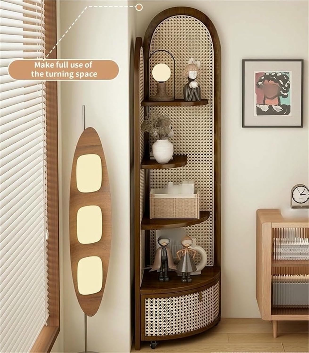 This wood rattan triangular cabinet seamlessly combines rustic charm with practical corner-specific functionality, making it an ideal choice for maximizing storage in various spaces. Perfect for living rooms, reading nooks, and small homes, this cabinet transforms underutilized corners into stylish storage solutions. Measuring 17.3 x 59.8 inches, this modern piece not only serves as a distinctive storage unit but also enhances your home decor with its unique design. Crafted from high-quality wood, it promises durability and long-lasting use. Whether you need extra space for books in your study, display items in your office, or simply want to organize your living room, this corner shelf adapts to your needs while adding a touch of elegance to your environment. Please note the following before making your purchase: 1. Product images may not include items other than the cabinet. 2. Confirm the desired color and size to ensure it fits your space perfectly. 3. Manual measurements may result in slight size variations; please refer to the actual product. 4. Color discrepancies may occur due to lighting conditions or monitor settings, and we appreciate your understanding. Elevate your interior design and organization with this versatile triangular cabinet, designed to enhance both functionality and aesthetics in any room.
