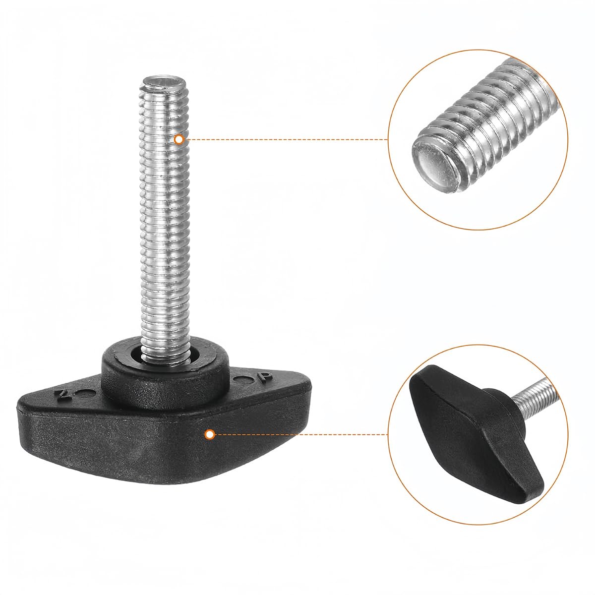 Features: These M6 T-shaped thumbscrews combine a galvanized carbon steel threaded bolt with a sturdy plastic handle for easy manual tightening. Their ergonomic T-shaped head allows for tool-free torque application, making them ideal for frequent assembly and disassembly operations. Each knob includes a precision-molded metal insert that ensures a stable connection and prevents loosening by vibration. Ideal for workshops, factories or machinery installations, these clamping knobs allow for quick adjustments in various mechanical and industrial environments. Specifications: Material: Plastic and galvanized carbon steel Thread Size: M6 Thread Length 40mm T-shaped head width: 35 mm Total length: 54.5mm Colour: black. Type: T-Handle Thumbscrew Function: Manual clamping, fixing and quick adjustment Package includes: 4 x M6 x 40mm T-shaped wing screws