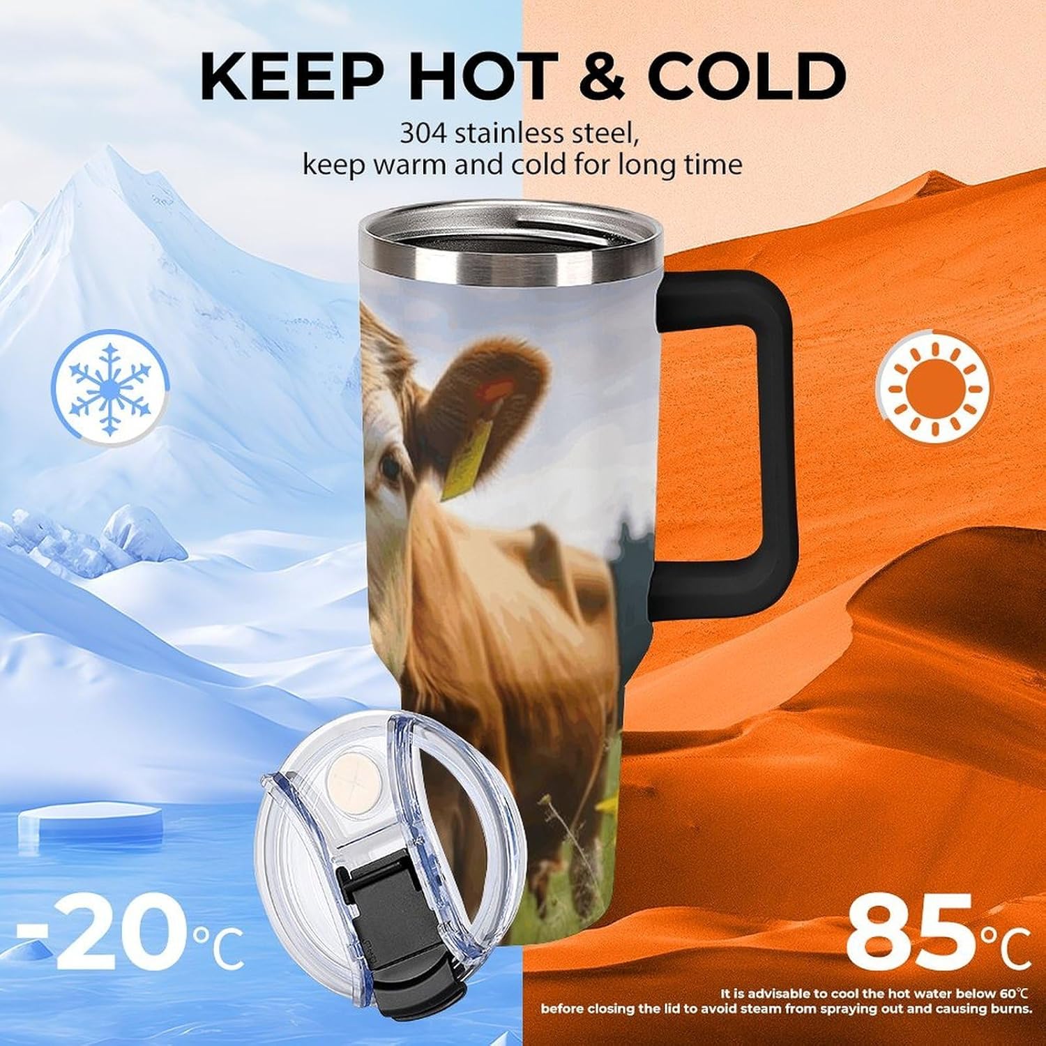 40 oz Tumbler: Keep Your Drinks Hot or Cold for Longer Perfect for long trips or days at the beach, this 40 oz thermal tumbler keeps your drinks at the perfect temperature for hours. The Tumbler is made from 304 stainless steel and fits standard cupholders, and with a variety of pattern options, you can get an Emotional Support Water Bottle. Its double-wall stainless steel design ensures optimal insulation, while the leak-proof lid prevents spills. Plus, its 180-degree rotating handle adds convenience and practicality to your daily adventures. Capacity: 40 oz (approx. 1.2 liters) Double-wall insulation Leak-proof lid 180-degree rotating handle Enjoy your favorite drinks anytime, anywhere with this versatile and practical thermal tumbler! Tumbler is double walled and vacuum insulated to keep your drink hot or cold for hours. The cup is outfitted with an ergonomic handle, that is aesthetically designed for comfort. It comes with a straw lid and two straws so you can enjoy your favorite beverage on the go.