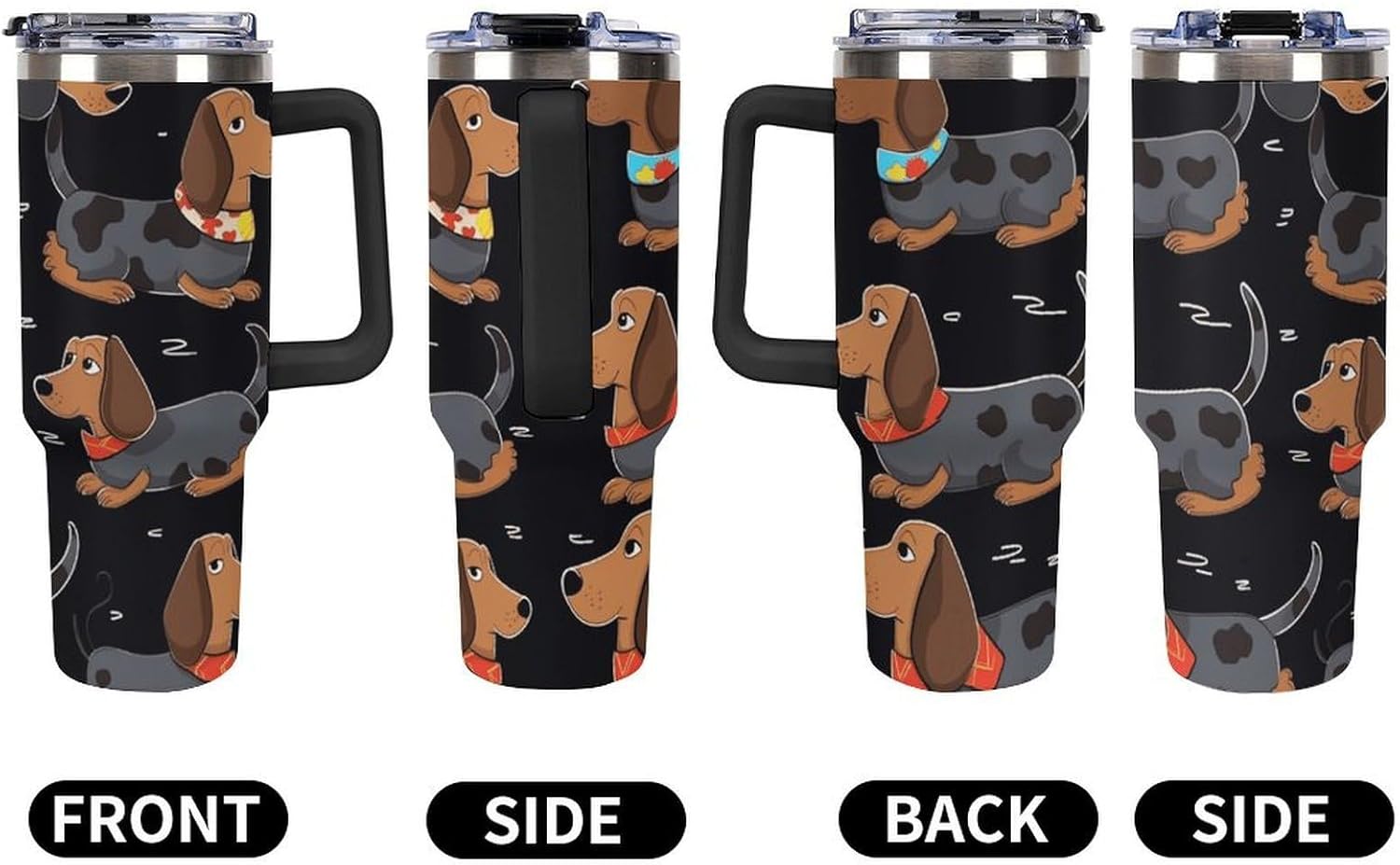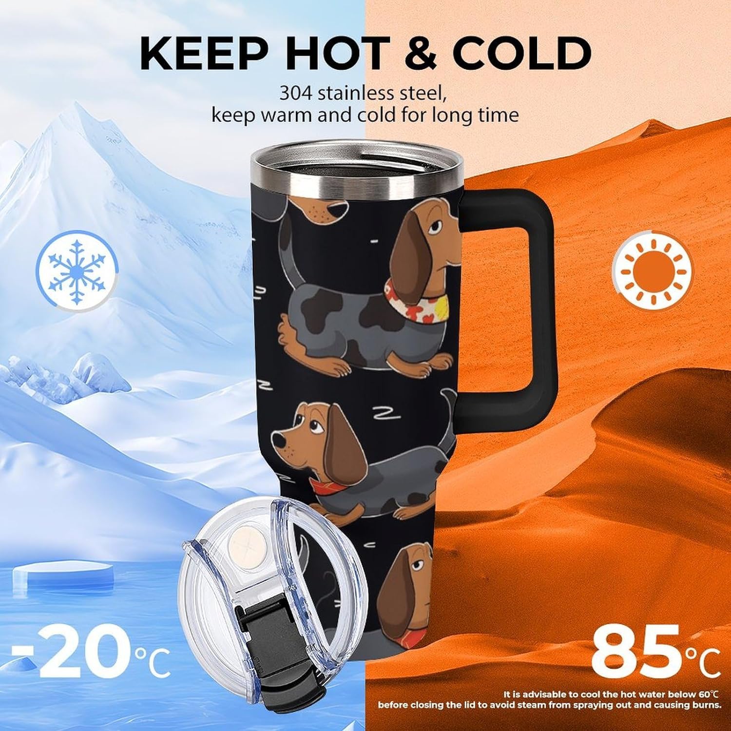 40 oz Tumbler: Keep Your Drinks Hot or Cold for Longer Perfect for long trips or days at the beach, this 40 oz thermal tumbler keeps your drinks at the perfect temperature for hours. The Tumbler is made from 304 stainless steel and fits standard cupholders, and with a variety of pattern options, you can get an Emotional Support Water Bottle. Its double-wall stainless steel design ensures optimal insulation, while the leak-proof lid prevents spills. Plus, its 180-degree rotating handle adds convenience and practicality to your daily adventures. Capacity: 40 oz (approx. 1.2 liters) Double-wall insulation Leak-proof lid 180-degree rotating handle Enjoy your favorite drinks anytime, anywhere with this versatile and practical thermal tumbler! Tumbler is double walled and vacuum insulated to keep your drink hot or cold for hours. The cup is outfitted with an ergonomic handle, that is aesthetically designed for comfort. It comes with a straw lid and two straws so you can enjoy your favorite beverage on the go.