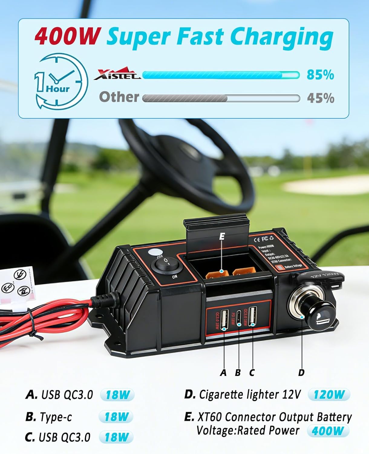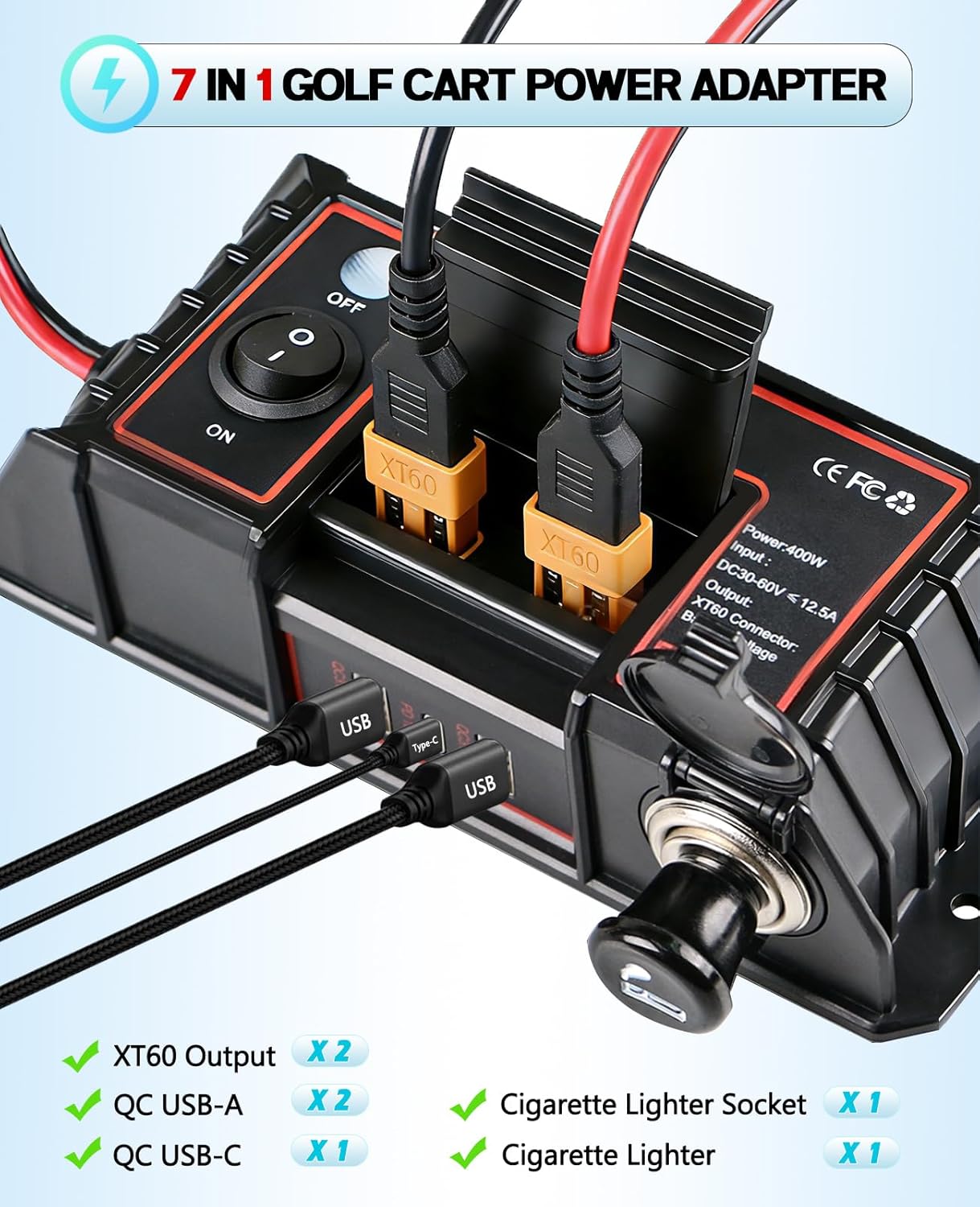 Upgrade Your Golf Cart Power System!Turn your 36V/48V golf cart into a versatile power station. Our 400W Golf Cart Power Adapter solves the key problem of using standard electronics on your high-voltage cart.Key Benefits:2 High-Power XT60 Outputs: 400W (600W peak) to run demanding accessories like heaters, coolers, audio systems, or drone chargers via the XT60 port.3 Fast USB Charging: Charge phones, tablets, speakers simultaneously with 2 Quick Charge 3.0 USB-A ports and 1 Quick Charge 3.0 USB-C port (18W each).12V Cigarette Lighter Socket: Deliver 120W of power.Universal & Easy Install: Wide 30-60V input fits most carts. Install in minutes with included 3M tape and screws—NO DRILLING REQUIRED.Built to Last: Advanced safety protections and IP66 waterproof housing ensure safe, reliable performance.Perfect For: Powering phone holders, cigar lighters, portable fridges, extra lighting, and more. It's the missing link for a fully-functional golf cart.Specs:Input: DC 30-60V ≤12.5A.Outputs: XT60 (Battery Voltage/400W), 12V/120W Cigarette Lighter, USB-A (QC3.0, 18W)x2, USB-C (QC3.0, 18W)x1.Protections: Over-voltage/current/load/power, short-circuit, under-voltage, over-temperature.