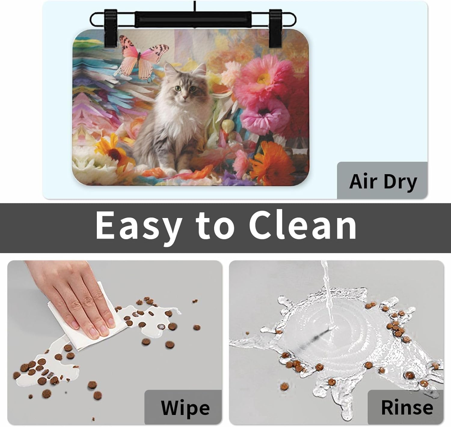 WZYCWB Sitting grey cat Material description Surface: PU, bottom: rubber\r\nProduct performance This pet tablecloth can prevent liquid spills. Super strong water absorption and quick drying ability, avoid getting pet paws wet, and keep the pet's eating environment clean. When food and water fall on the dog food mat, no traces will be left. Unlike traditional silicone pet feeding mats, our pet feeding mat will not be stained with pet hair or dust, nor will it form scale that is difficult to clean. When not in use, it can be rolled up for easy carrying and space saving. The non-slip rubber pad on the bottom keeps the dog mat in place no matter how your pet pushes it. The waterproof rubber bottom prevents water from seeping into the floor. The food and water on the pet bowl mat will not cause floor corrosion, reducing wear and tear on the floor. \r\nApplicable scenarios Suitable for dogs, cats or other pets. It can be used for pet food and water bowls or automatic feeders, and can also be used as a special mat for pet bowls. \r\nWashing instructions It can be washed or scrubbed, cannot be bleached, and dried naturally. \r\nSpecial instructions Due to different measurement methods, the size data has an error of 1-3cm, which is normal.