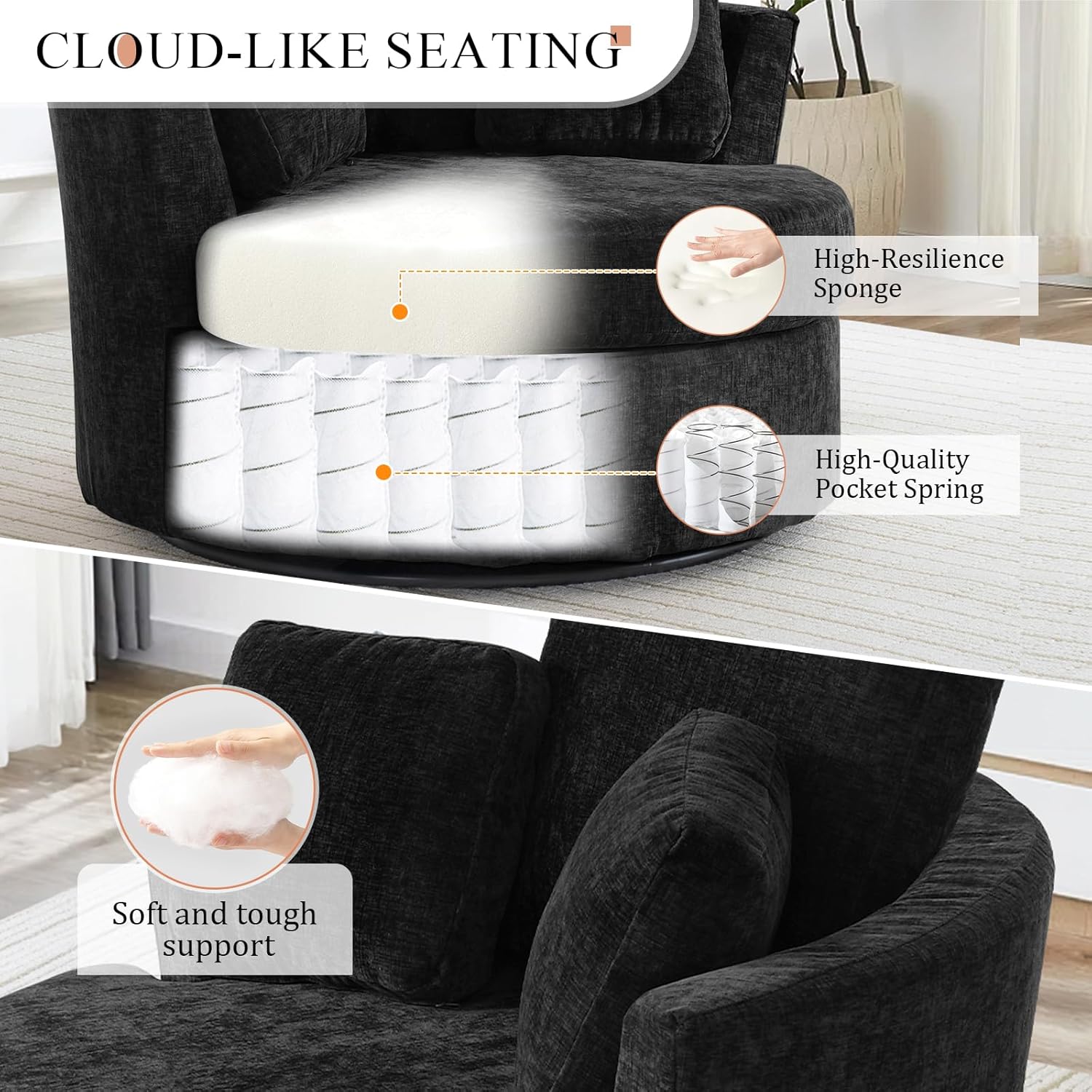 Specifications:Material: Chenille fabric+ solid wood + high-density sponge + metalOverall Size: 42"D*42"W*35"HWhy This Chair Rocks 1. Big & Comfy - Seat Size: Perfectly circular 42-inch seat - Weight Limit: Holds up to 500 lbs – great for all body types - Thick Cushion: 12cm soft padding (thicker than most sofas!) 2. Tough & Safe - Metal Base: Stainless steel legs that spin smoothly (tested for 100,000 spins) - Wood Frame: Solid hardwood skeleton hidden inside - Anti-Slip: Rubber feet that grip floors (even on tiles) 3. Easy to Clean - Fabric resists spills (coffee wipes off in 15 seconds) - Removable cushion covers for washing 4. Small Spaces Winner - Fits in tight spots: ✓ Studio apartments (needs just 3x3 ft space) ✓ Dorm rooms (folds up when moving) ✓ Office corners (spins to reach desks/shelves) 5. Multi-Use Magic - Relaxing: Curved barrel back hugs your body for reading/napping - Decor: Modern white color matches any room style Pro Tip: Spin slowly for smooth operation – no need to push hard!