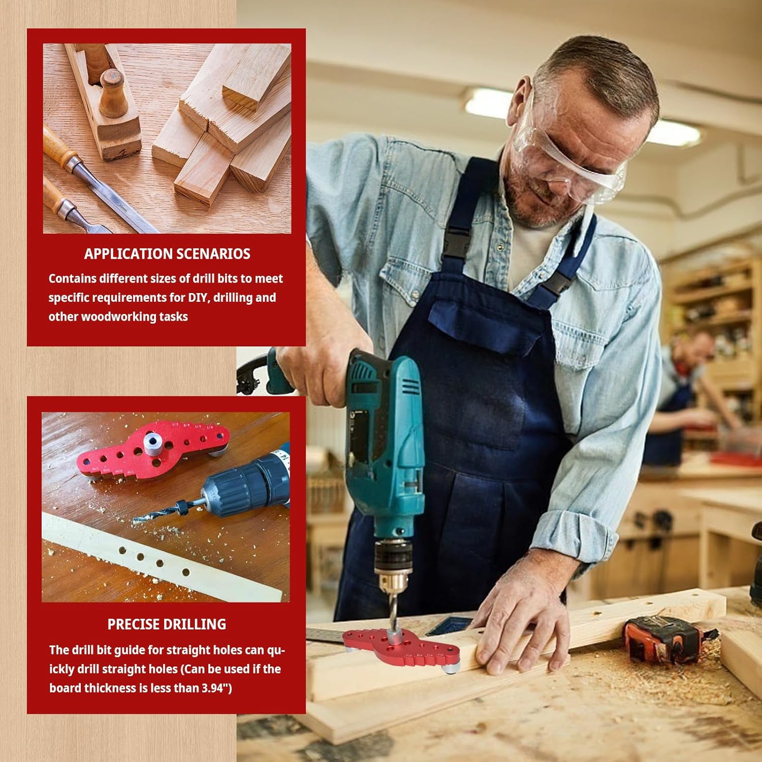 | Included Components | 1/4", 5/16", 3/8" drill bit limit rings each, 1/4", 5/16", 3/8" guide nuts, 1/4", 5/16", 3/8" tri-point twist drill, locator, two small wrenches,1/4", 5/16", 3/8",10 wooden tenons each |