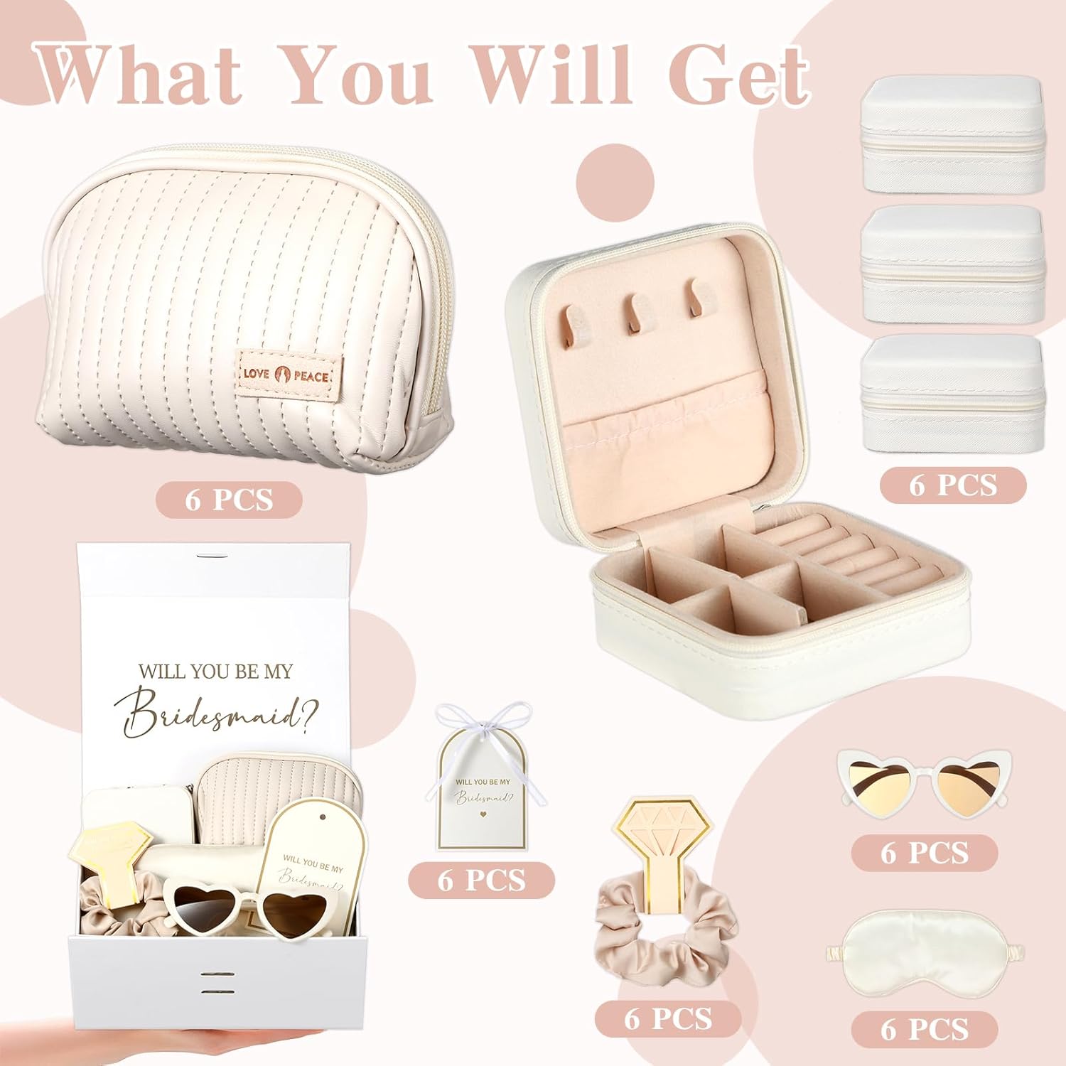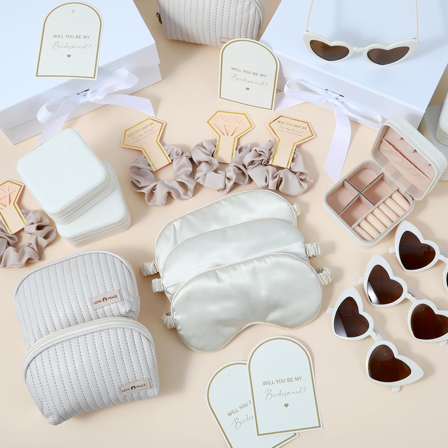43 Pcs Bridesmaid Proposal Gifts Set of 6 Bridesmaid Boxes Bulk Will You Be My Maid of Honor Gift with Makeup Bag Case Eye Mask Glasses Hair Scrunchies Gift Box for Wedding Bride Shower(Beige) Specifications: Color: Beige Set Includes: 6 eye masks 6 makeup bags 6 makeup cases 6 hair scrunchies 6 glasses 6 medium-sized white gift boxes off-white raffia 6 ribbon greeting cards The bridal shower wedding party favor is crafted from high-quality materials such as canvas. Its prints are long-lasting and wear-resistant, and it can maintain a stylish appearance even after long-term use. The will you be my bridesmaid proposal boxes gifts set features off-white as the main color and combines classic and fashionable elements, highlighting elegant taste. It can meet the gift needs of up to 6 bridesmaids at one time, making it an affordable and ideal choice for expressing your heartfelt feelings and adding joy to important occasions.