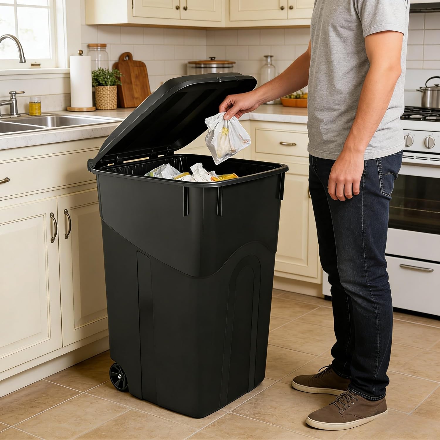 Equipped with durable casters, allowing for smooth and easy movement, convenient for use in outdoor locations such as balconies, patios, and garages.26.090 inches (L) × 21.690 inches (W) × 33.700 inches (H). Its simple and efficient design and high-quality materials help you easily handle daily garbage collection and cleaning tasks. The wide, one-piece handle offers a comfortable grip and even weight distribution, making lifting and emptying garbage easier and more stable.Made of high-quality, high-strength plastic, it is impact-resistant and wear-resistant, able to withstand frequent daily use and heavy objects, and is not prone to cracking or deformation, resulting in a longer service life.: The snap-on sealing cap closes securely, preventing pets from rummaging through and garbage from spilling. The smooth plastic material is easy to clean; daily maintenance only requires a simple rinse, saving time and effort.