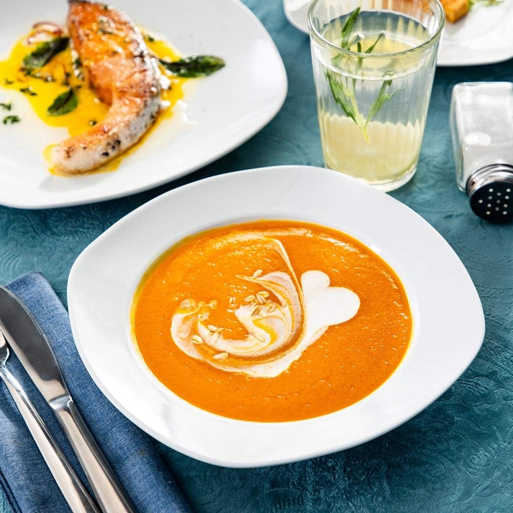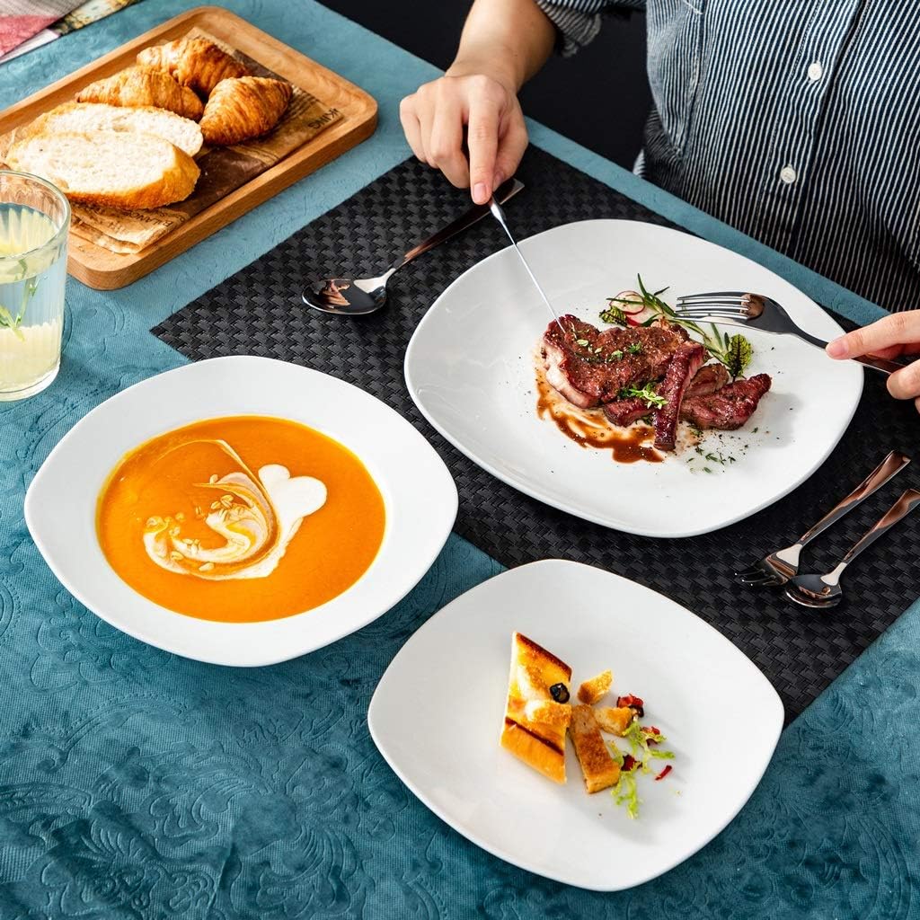 48-Piece Cream White Dinner Combi-Set to Meet Your Different Needs for 12.FOR EVERYDAY USE- The plates are suitable for daily dessert, hot cereal, a cup of soup, rice, pudding, a little side.Simple design easily matches with existing flatware in your kitchen, dine.MICROWAVE SAFER AND DISHWASHER SAFE- Fired in High Temperature, Not Easy to Be Broken. Safe in Oven, Freezer, Dishwasher and Microwave.PACKAGE INCLUDED- Contains 12 Pieces of each: 9.75" dinner plates, 8.5" soup plates, 7.5" dessert plates and 6.7" Bowl.DIMENSION:9.75" Dinner Plate L*W*H: 24.7*24.7*2.2cm Weight: 660g8.5" Soup Plate L*W*H: 21.5*21.5*3.8cm Weight: 431g7.5" Dessert Plate L*W*H: 19.2*19.2*2cm Weight: 361g6.7" Bowl L*W*H: 17*17*5cm Weight: 300gFor Everyday Usand Porcelain, and , Longer Using Time. Can Withstand Extremes of Low & High Temperature, Microwave and Dishwasher Safe.48-Piece Cream White Dinner Combi-Set to Meet Your Different Needs for 12. Great for Home, Restaurants and Cafes Use. for Daily Use or Festival Decoration.Only the above package content, other products are not included.Note: Light shooting and different displays may cause the color of the item in the picture a little different from the real thing. The measurement allowed error is +/- 1-3cm.dinnerware sets with serving bowlsflatware and dish set bundl