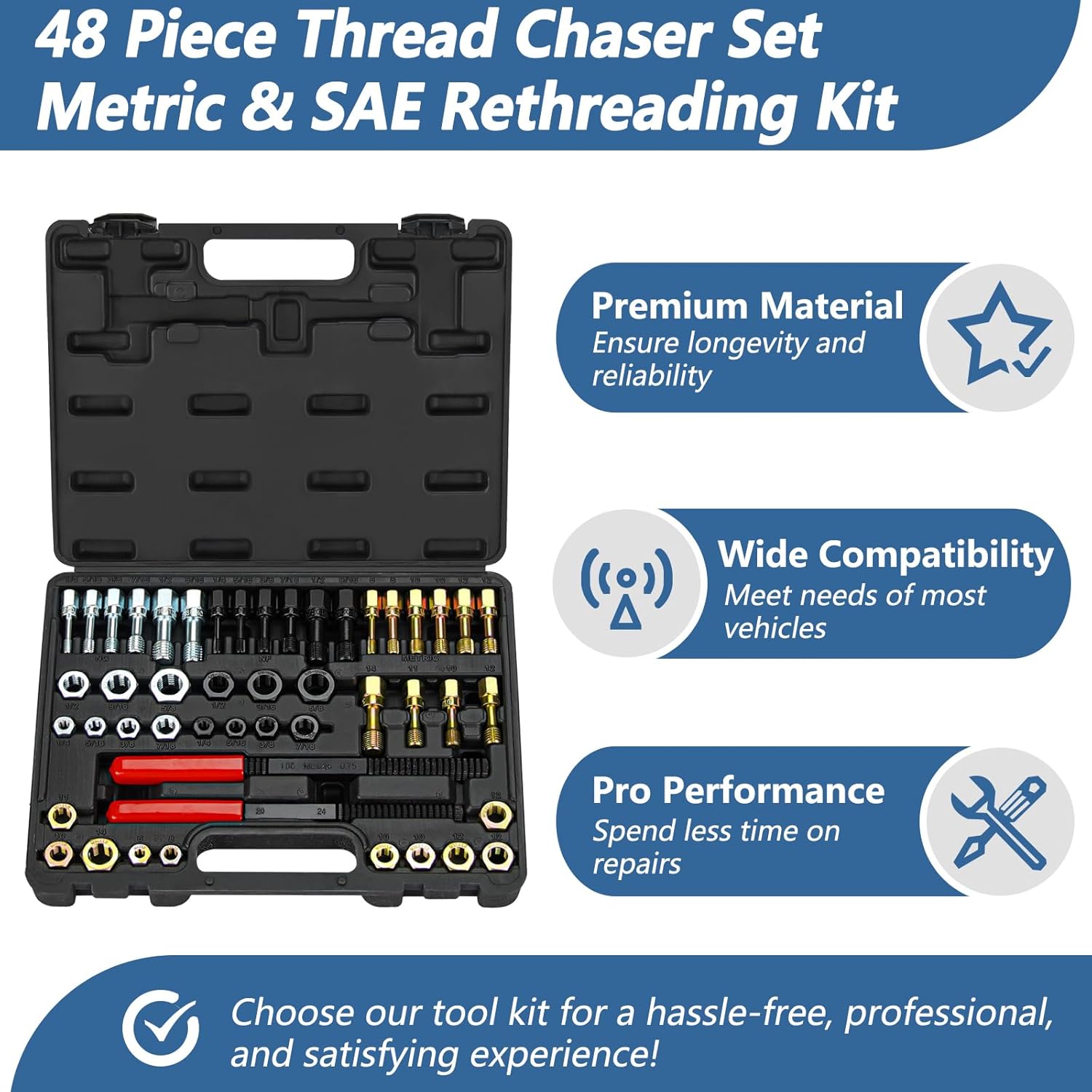 48 Piece Thread Chaser Set Metric & SAE Rethreading Kit with 22 Taps 24 Dies 2 Thread Files Thread Repair Kit