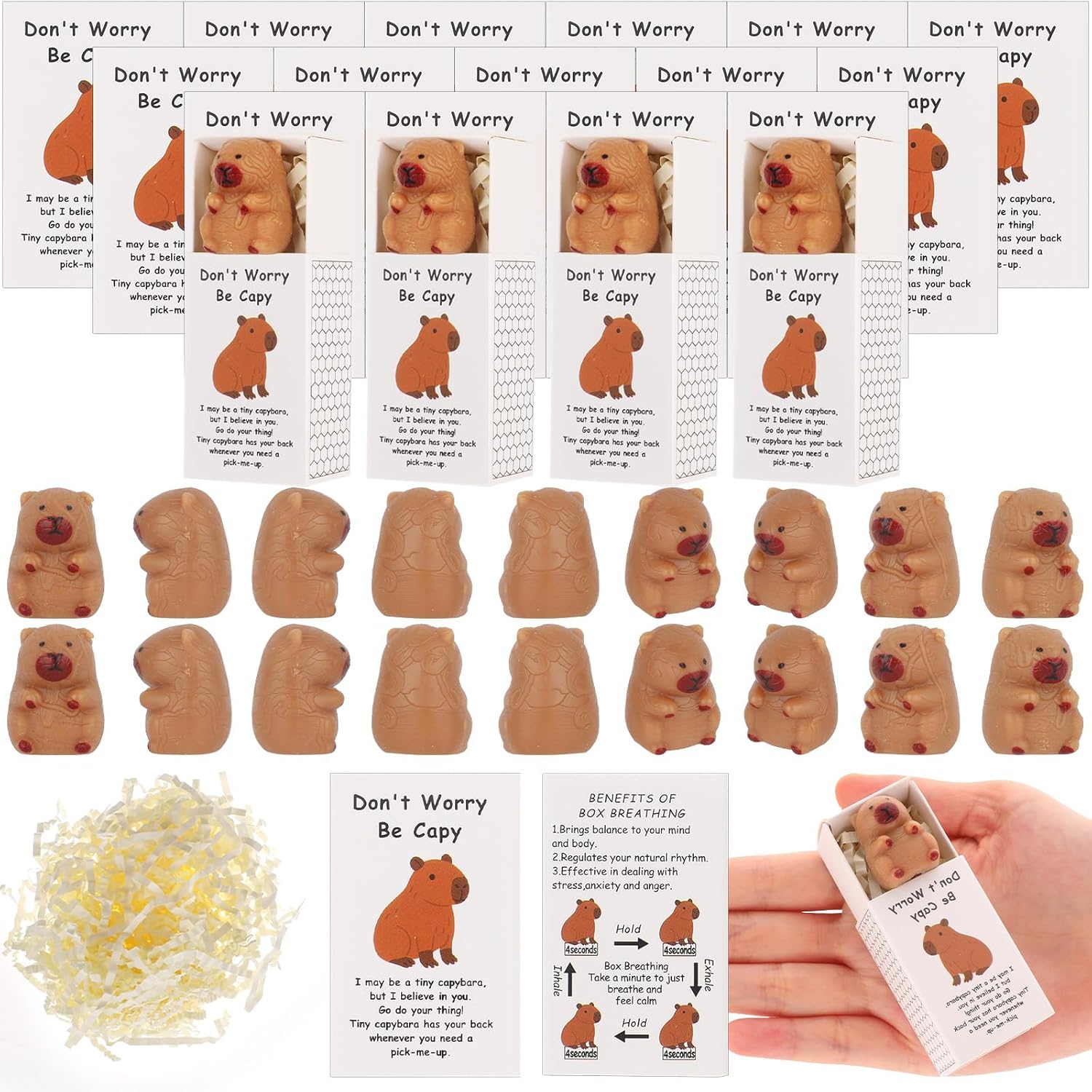 Features:Featuring an adorable capybara design paired with uplifting messages, these stress balls bring a smile while helping to melt away tension. The clever “breathing box” concept adds a calming touch—when stress strikes, simply open the box, take a deep breath, and squeeze your way to relaxation.Specifications:Material: soft rubberColor: brownSize: As shown in the picturePackage includes:48 x Capybara48 x Gift box50g raffiaNotes:Manual measurement, please allow slight errors on size.The color may show a slight difference due to different screen displays.