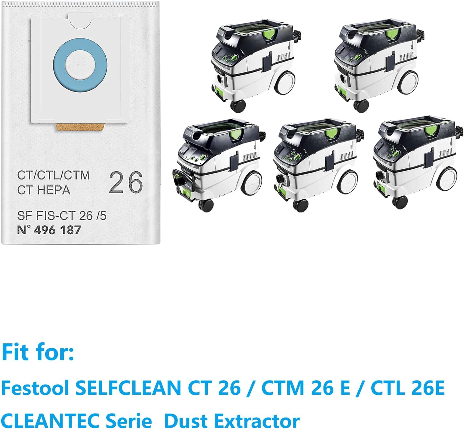 Compatible Model: The vacuum cleaner dust bags are ONLY compatible with Festool SELFCLEAN CT 26, CTL 26 E, CTL 26E AC, CTM 26 E and CTM 26E AC dust extractor (Please confirm your vacuum cleaner model before buying!) Value Pack: 8 pack vacuum cleaner replcement bags 5-Layer Filtration System: The dust bags replacement are made of three layers of non-woven fabric and two layers of melt-blown fiber, which has high-efficiency filtering ability and tear resistance, and is durable, creating a clean environment for you.