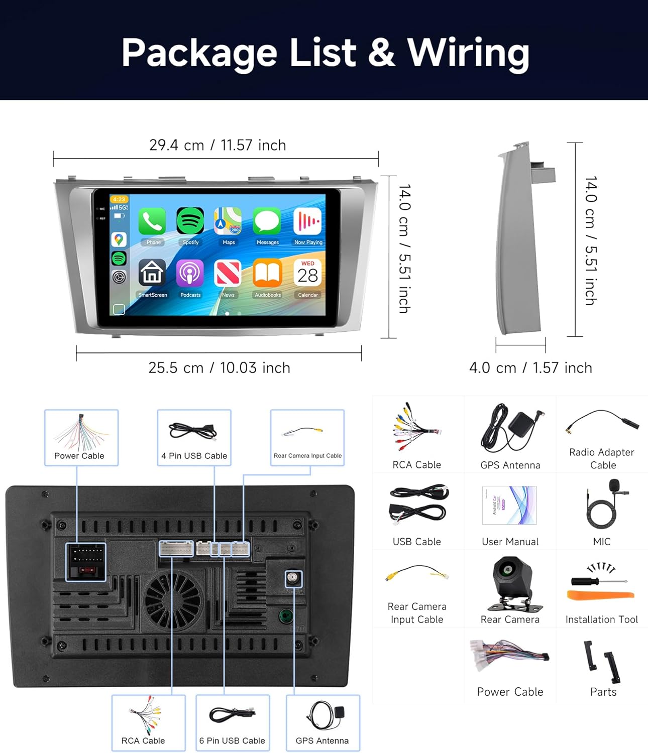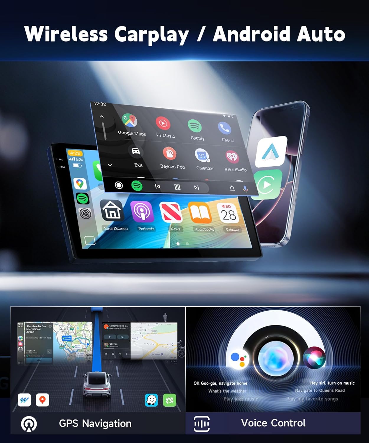 | Additional Features | 1280*720P Incell touchscreen, 32-band DSP, 5G WiFi, GPS, Wireless CarPlay Android Auto |