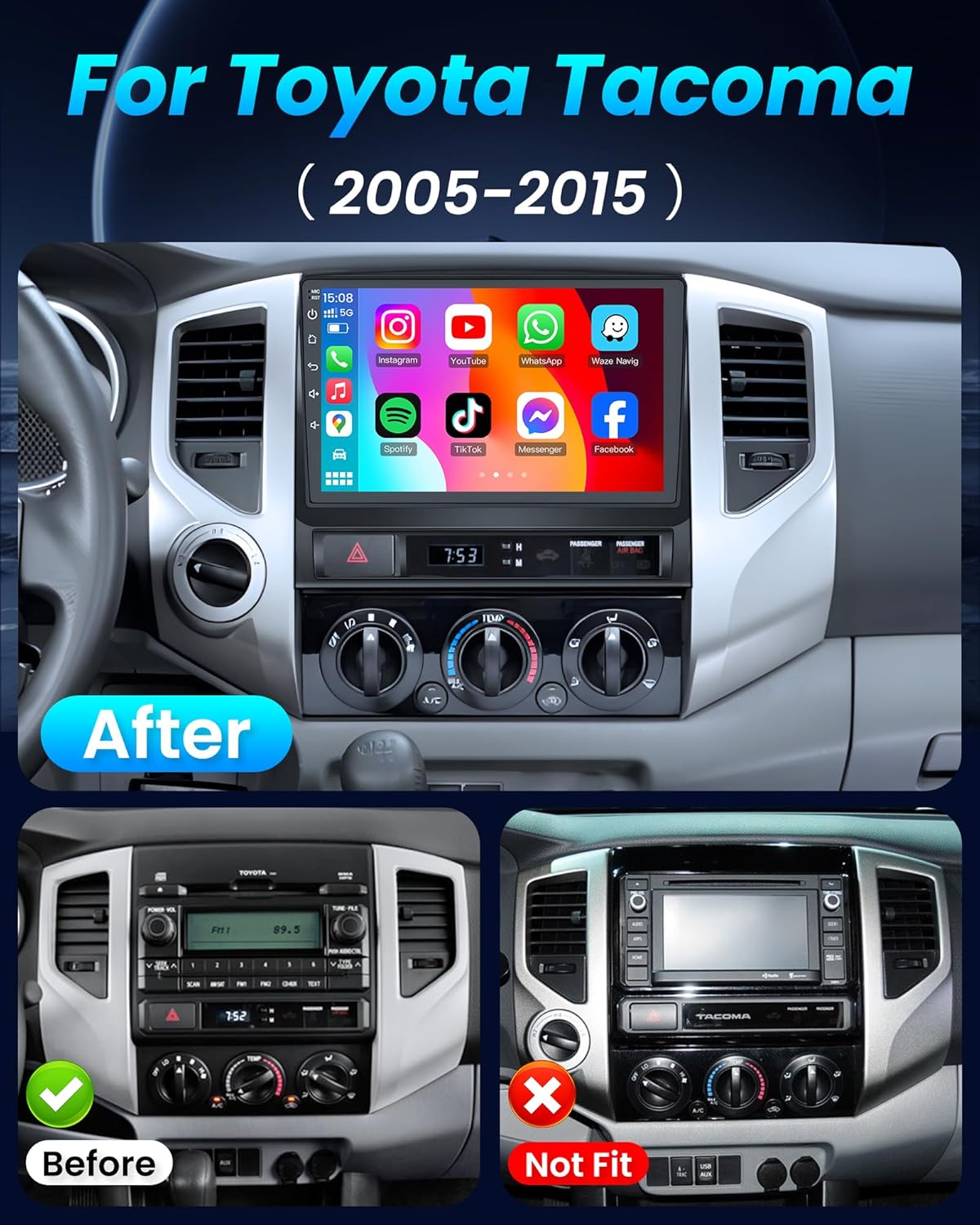 | Additional Features | Wireless Carplay & Android Auto | Voice Control | 1280*800 Touchscreen | 1080P Backup Camera | GPS | Microphone | FM | SWC | Mirror Link | Bluetooth | 5G WiFi |