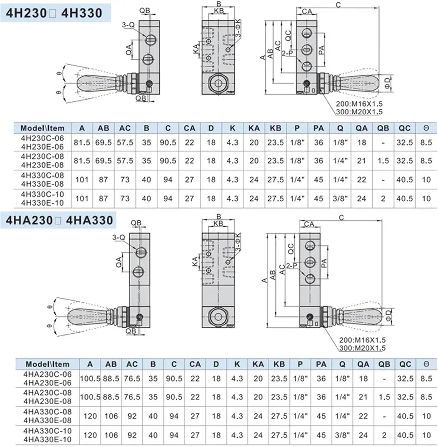 Control ValvesType : ValvesModel Number : 4H230C/E-06/08 4HA230C/E-06/08 Valve type : 5/2WayOrifice size : 14mm2(CV=0.78) or 16mm2(CV=0.89) etc.Port size : 1/8" and 1/4"Operating pressure : 0~0.8MPa(0~116psi)Max.proof pressure : 1.5MPa(215psi)Temperature : 5~50Material body : Aluminum alloyOperating : Manual control direct acting type