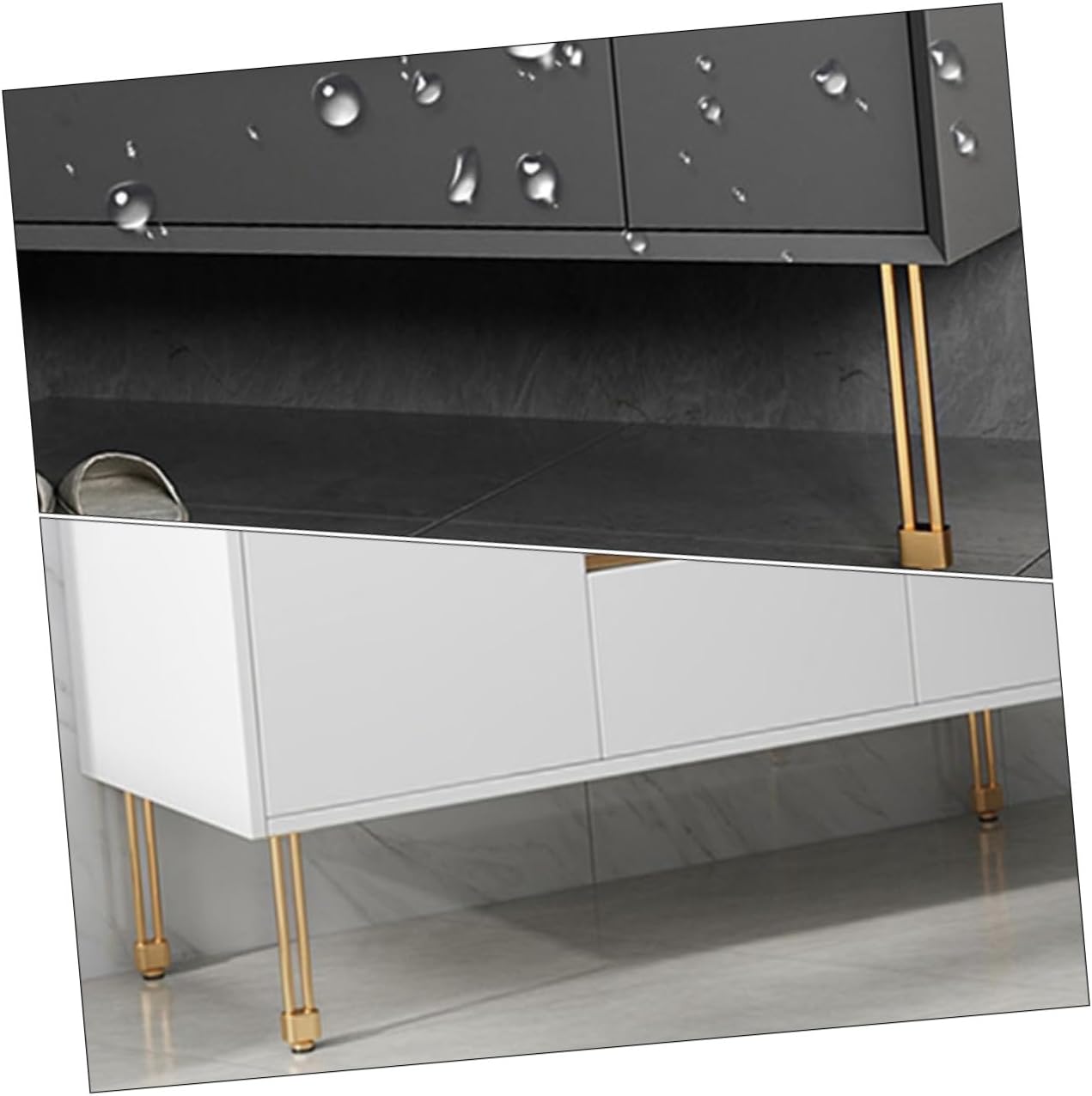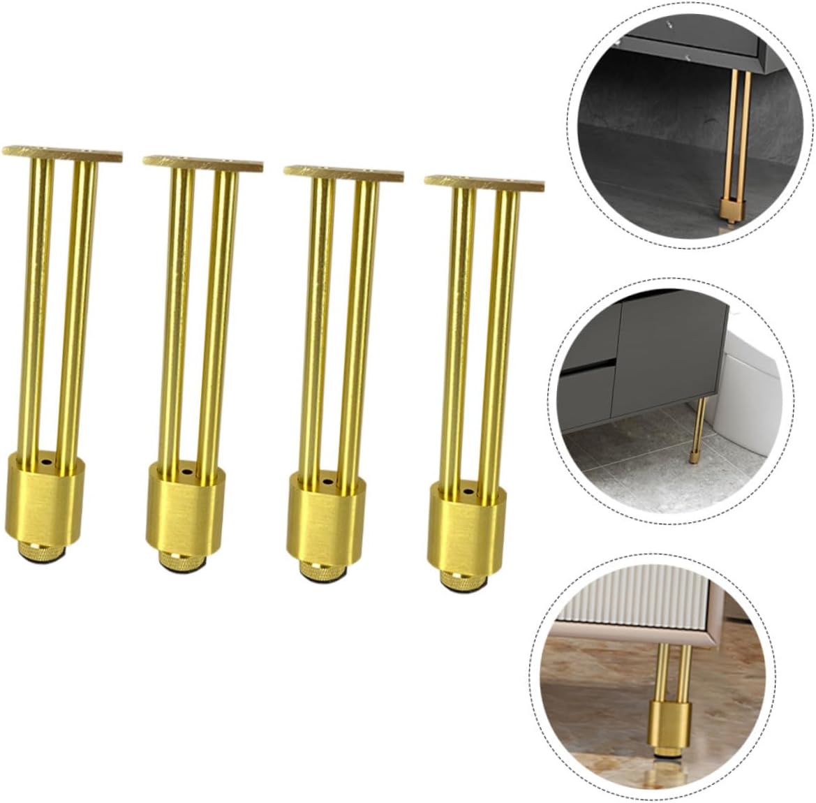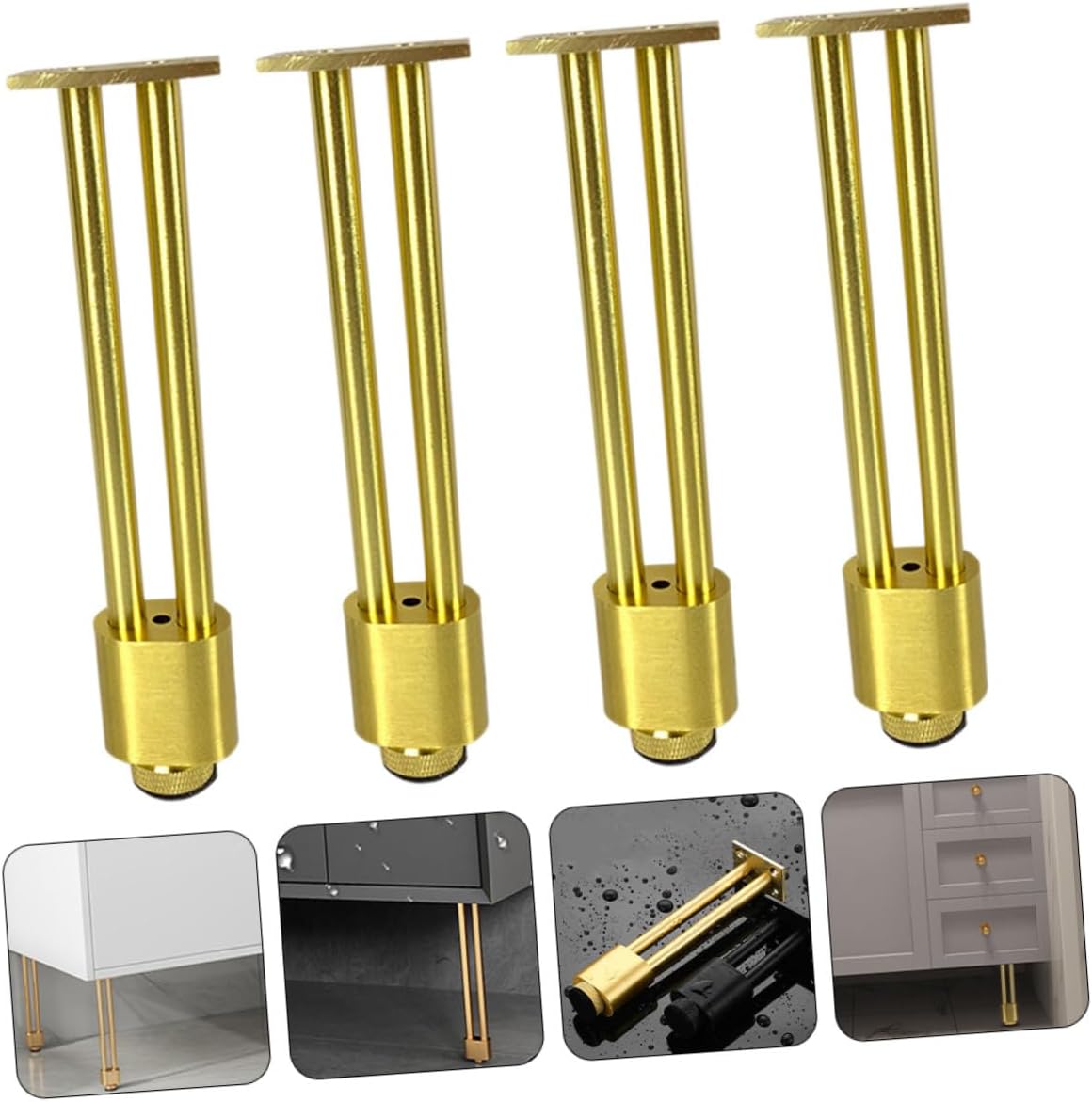 Package List 4 x Furniture Legs Features -Color:Golden -Product Info:Bathroom cabinet feet -Material:Aluminum alloy -Size:10.00X4.00X2.50cm/3.93X1.57X0.98in -Made of heavy duty aluminum alloy, not easy to crack, break or deform, can serve you for long term furniture support leg. -These furniture feet can also help you reduce the friction between the furniture and the floor, achieve better protection effect metal legs for table. -You can use them in damp rooms, such as kitchens and bathrooms, prevent water from cabinets metal furniture leg. -This furniture feet leg provides you an easy and convenient way for you to replace your furniture legs table leveling feet. -Easy to install and remove, save much of your time and efforts, can well meet your needs table leg risers.Goods Descriptionfurniture feet These furniture legs can be used at home, office, restaurant, school, cafe shop.cabinet leveling legs Provide you good stability to well lift up your furniture, very stable after installation.table leg risers Work great for chairs, tables, cabinets, display racks, cupboard, shelves, plant rack, sofa, etc