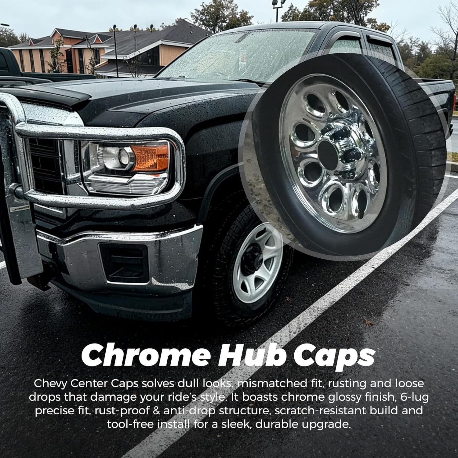 The 6 lug hub caps chrome are designed to support both function and appearance for daily driving. Suitable for owners looking to refresh worn wheel hubs or improve vehicle aesthetics, these chevy silverado center caps offer a clean and polished look whilehelping maintain the condition of essential wheel components. Their snap-on structure makes them convenient for routine replacement or style upgrades.Built for compatibility with 2005-2013 Chevy Silverado 1500 and 2007-2013 Chevy Tahoe, Avalanche, and Suburban 1500, these caps fit painted wheels and replace OEM part numbers 15067580 and 15067578. This design helps simplify part selection, reducingconfusion from unclear references and offering a fit aligned with factory specifications for consistent performance.Constructed from ABS plastic with chrome plated and rubber, the black chevy center caps offer strength suited for road use. Their chrome finish helps resist wear from long-term exposure while maintaining a refined appearance. The structure supportsdurability against driving conditions and helps reduce concerns related to loosening, fading, or repeated replacement needs. Installation requires no specialized tools, allowing users to replace old caps with a simple press-on action.Whether used for maintenance or style enhancement, these chevy center caps offer a practical experience for truck and SUV owners. Their user-friendly design supports smooth installation and steady performance during daily use. We aim to provide productsthat meet functional expectations and offer long-term value, helping maintain a neat and consistent look for your wheels.