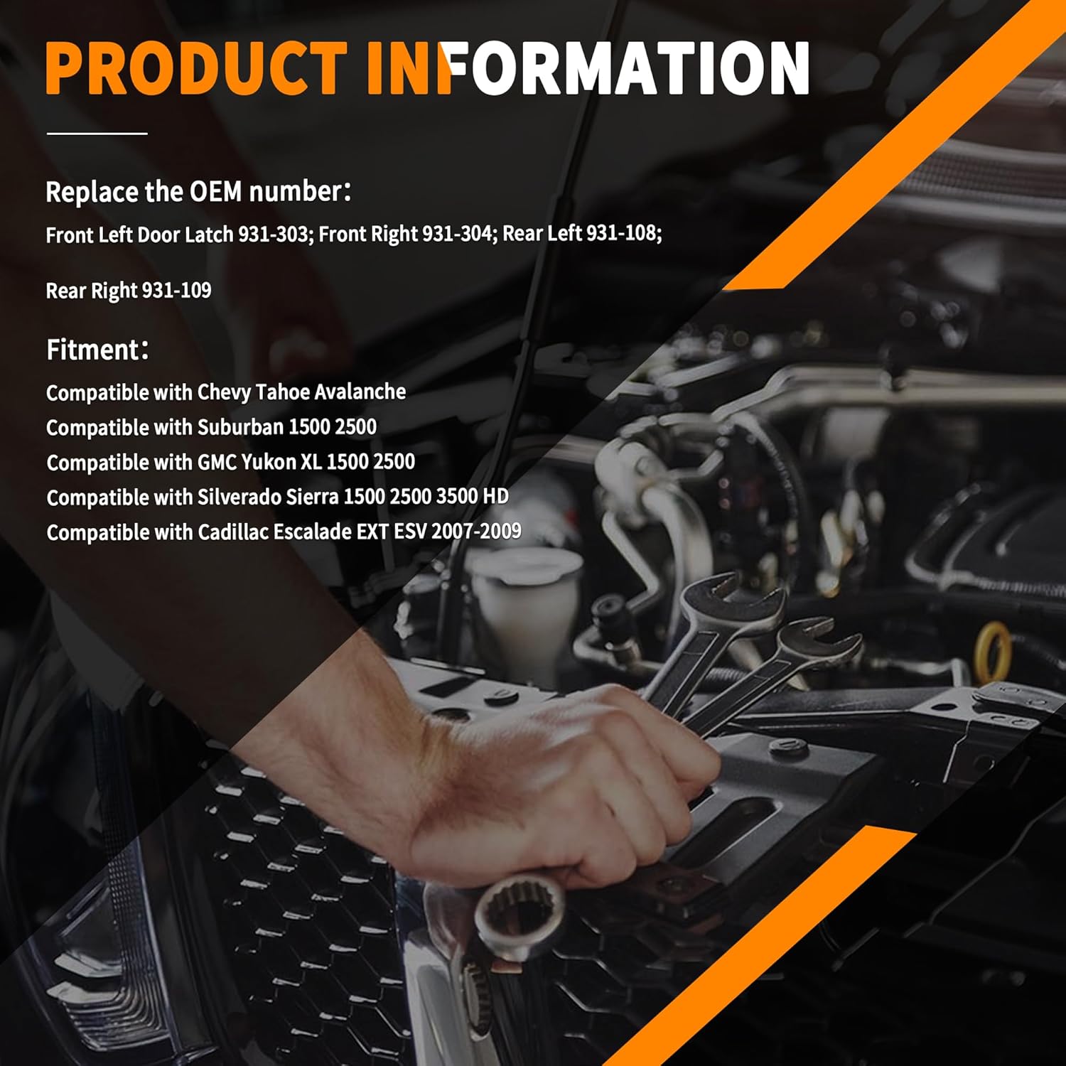 Replace the OEM number: Front Left: 931-303,25866299,25811737,25879296,25789211,25811735,25876386,20783846,2586302,25876382, 25876385 Rear Left: 931-108, DLA822,25876389,15785128,931108,20783857,15896626,25873488 Front Right: 931-304, 8D1600,25873485,931304,25876388,20783852,25945754 Rear Right: 931-109,DLA817,931327,931109,931-327,25876390,25873487,20783858,15785127,25789216,20783860,25876392,25876394,15896625,15896627,20783862 Fitment: Compatible with Cadillac Series Compatible with 2007-2009 Cadillac Escalade Compatible with 2007-2009 Cadillac Escalade EXT Compatible with 2007-2009 Cadillac Escalade ESV Compatible with GMC Series Compatible with 2007-2009 GMC Yukon Compatible with 2007-2009 GMC Yukon XL 2500 Compatible with 2007-2009 GMC Yukon XL 1500 Compatible with 2007-2009 GMC Sierra 1500 Compatible with 2007-2009 GMC Sierra 2500 HD Compatible with 2007-2009 GMC Sierra 3500 HD Compatible with Chevy Series Compatible with 2007-2009 Chevy Suburban 2500 Compatible with 2007-2009 Chevy Suburban 1500 Compatible with 2007-2009 Chevy Tahoe Compatible with 2007-2009 Chevy Avalanche Compatible with 2007-2009 Chevy Silverado 1500 Compatible with 2007-2009 Chevy Silverado 2500 HD Compatible with 2007-2009 Chevy Silverado 3500 HD