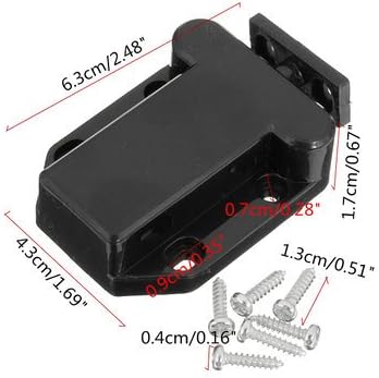 Description: Push Open Catch Touch Latch Release is suitable for installation in the absence of shake handshandle drawer or cabinet. Specification: Material:ABS Color:Black Size:(L)X(W)X(H) 6.3X4.3X1.7cm/2.48"X1.69"X0.67"(appr.) Features: 1.Suitable for installation in the absence of shake handshandle drawer or cabinet. 2.For use where magnets would be harmful, such as near computer tapes and disc storage. 3.Unique beetles shape, built-in clip spring contraction, push gently to open or close door. 4.Cannot be pulled open or pushed open from the inside by falling objects. 5.Counter piece consists of two parts allowing for easy adjustment even after the body is attached. 6.Simple to use and easy installation. Package included: 4 x Push Latch 24 x Screws