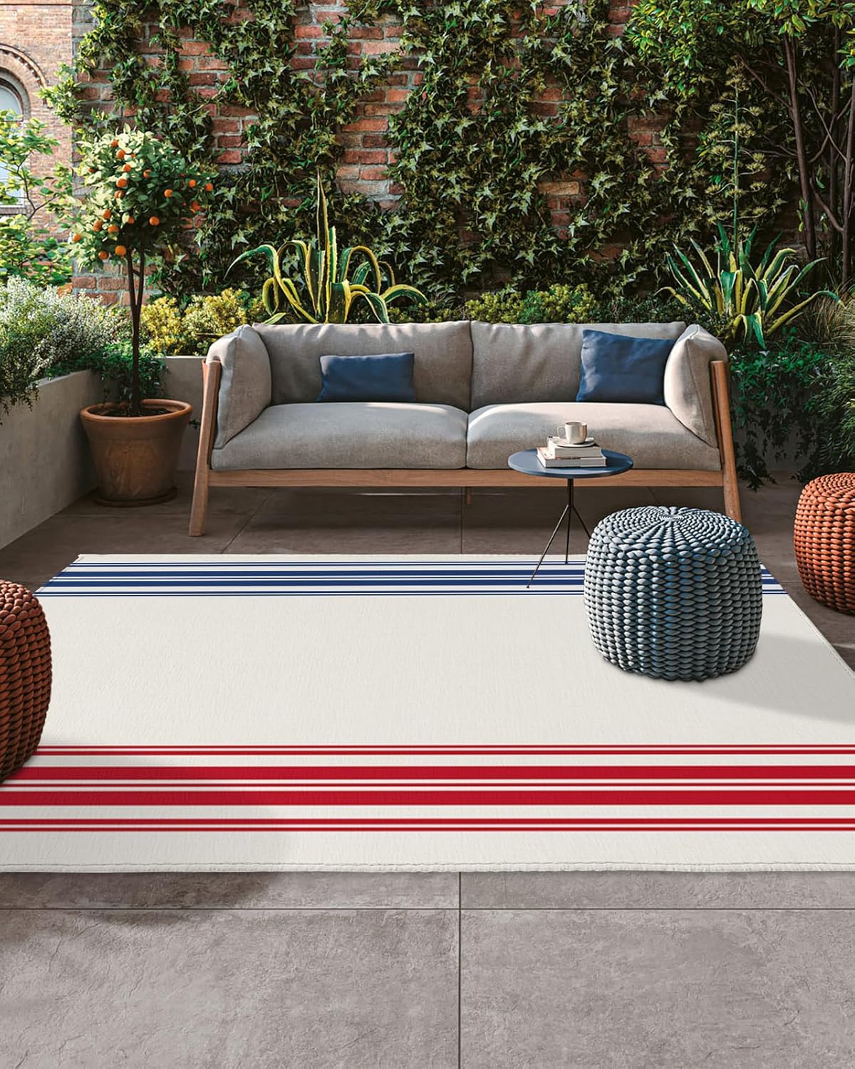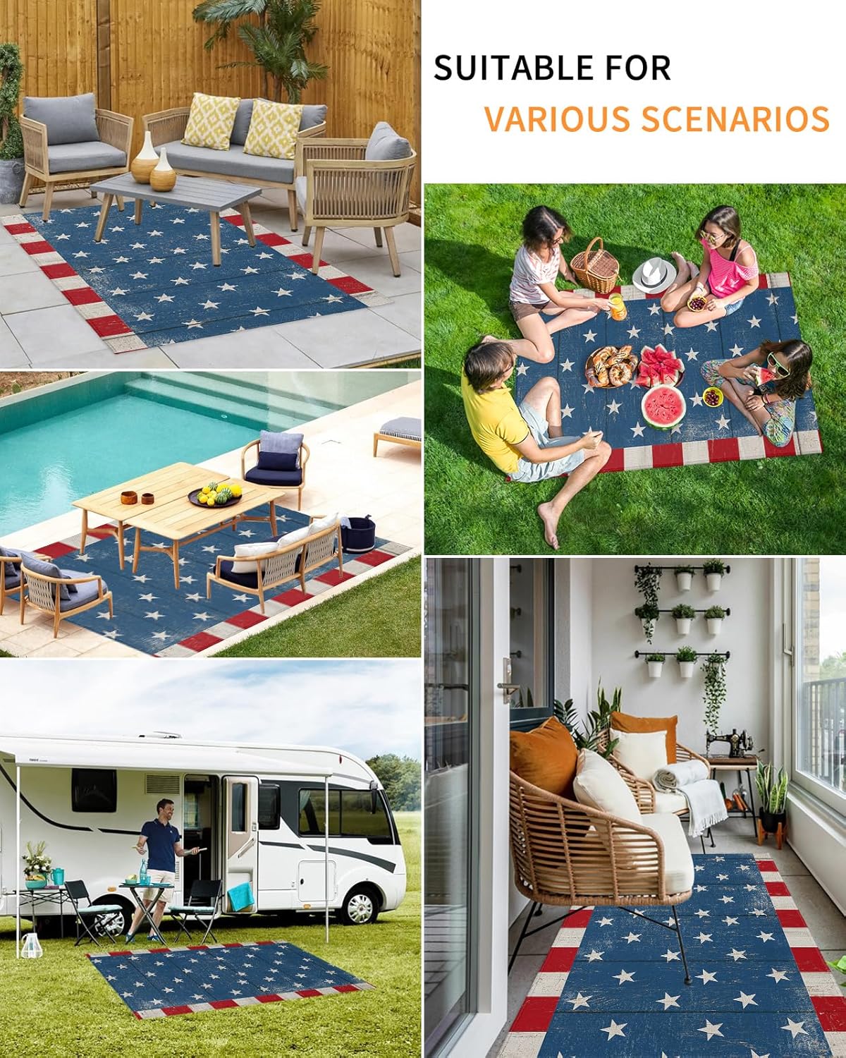 Enjoy supreme comfort and plush softness under your feet.Transform your existing decor with the chic modern style of our outdoor area rug carpet.Size4x6 ft5x8ft 6x9ftThickness measures: 0.2 in.Shape: RectangularBacking: Non-skip rubber points.Package includes:1 PC x Area RugsSpecial Note: Rugs may contain temporary creases upon arrival, allow time for creases to flatten and settle.How to remove carpet creases? 1. Wet the carpet and flatten it to air dry 2. Use a steam iron 3. Roll the area rug in reverse of the wrinkle or crease 4. Use a steam cleanerPremium MaterialMade from high-quality, soft, comfortable and strong durability. Provide a warmer and softer feel under your bare feet and knees, without damaging your deck or grass.Double-layer, outdoor mat is breathable, easy to clean, washable and quick dry.Multiple OccasionOutdoor rugs suitable for terrace, balcony, deck, garden, beach, porch, RV, camping, garage and other places.Versatile Mats Outdoor PatioThe outdoor rug can fit your patio style well, elegant as it is functional, not only protects the floor, but also adds a new view and to show off your personal style.Ideal Home DecorThe soft outdoor carpet is available in multiple colors and sizes to suit your different styles and needs, making it an ideal choice for home decoration.Wash TipsWhen the rug is dusty, only need to wash it with a hose outdoors.