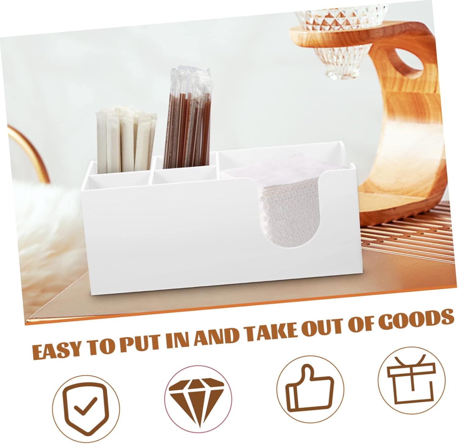 Package Include 1 x Coffee Station Organizer Characteristics - Color: White coffee stand station - Size: 26.00X13.00X10.00cm/10.22X5.11X3.93in packet holder -Material:Acrylic coffee tea organizer -The acrylic Coffee Bar Organizer has both beautiful appearance and with very in use desk organizer. -Fashion appearance, minimalist design, Coffee Station Organizer is suitable for most home decoration styles coffee station organizers. -Made of premium and sturdy acrylic material, coffee bar organizer box is and for use. tea organizers and storage -This Coffee Bar Organizer adopts multi-compartment design, reasonable partition, can store all kinds of items, such as paper cups, straws, sugar packets coffee countertop organizer. -Strong sense of design, acrylic material is lightweight, full of artistic charm coffee station organizer for office.Goods Descriptionsugar organizer for coffee station Suitable for home, hotel, cafe, bar, and more.tea organizer for tea bags The Coffee Bar Organizer allows you to easily take coffee straws, napkin, spoons, sugar bags, organized and keep countertop tidy.tea coffee station organizer Lightweight and easy to clean.plastic desktop organizer This Coffee Station Organizer is made of selected acrylic material, and for a long using time