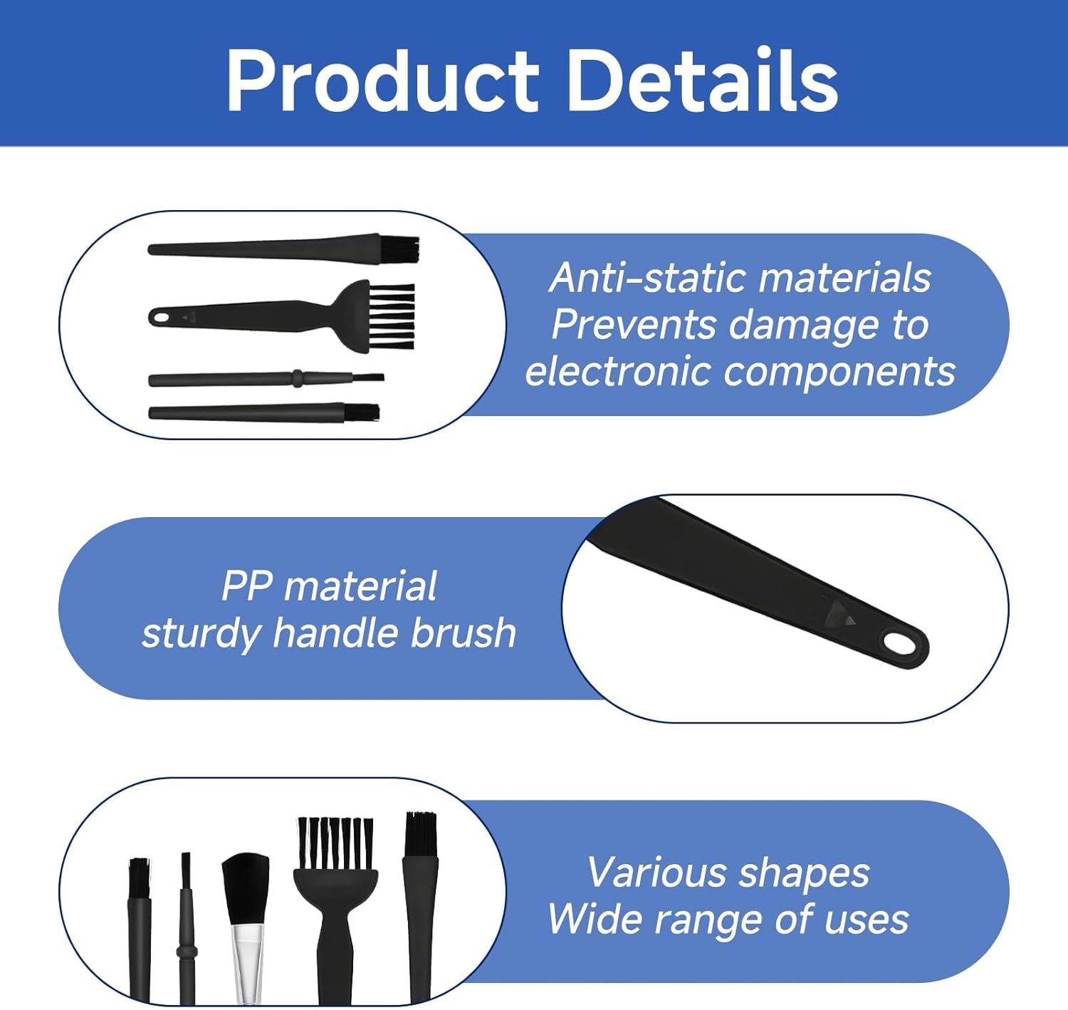 Specifications Product:Computer Cleaning Brush Colour: black. Key Features This anti-static brush is designed for effective and safe cleaning of sensitive electronic components. It is made of high quality PP material, with anti-static bristles that do not generate static electricity during use, thus protecting PCBs, heat sinks and fans from damage. The kit includes multiple brushes in various shapes and sizes, allowing easy access to narrow and hard to reach areas such as USB ports, air vents, button gaps or keyboard crannies. The ergonomic design of the non-slip handles ensures a comfortable grip and precise control when cleaning. Ideal for versatile use, this brush is suitable for cleaning laptops, digital cameras, mechanical keyboards, printers and various other electronic equipment. It removes dust and residues without leaving electrostatic charges, ensuring complete and secure maintenance of internal and external components.