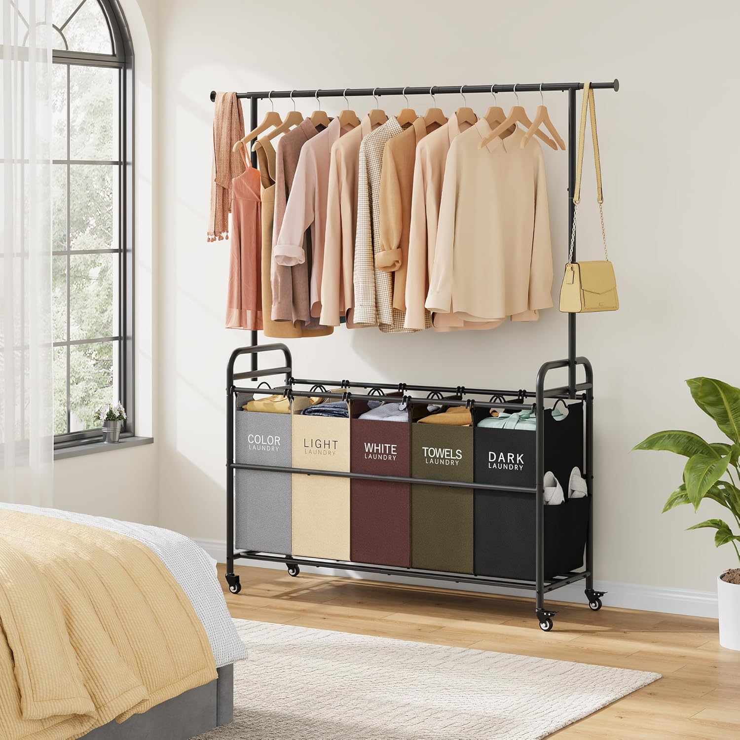2-in-1 Design: The laundry cart with hanging rack adds new organizing options. The sturdy hanging rack can be used as a drying or hanging daily clothes, and the retractable rods on both sides provide extra hanging space for long clothes, making your laundry day easier.