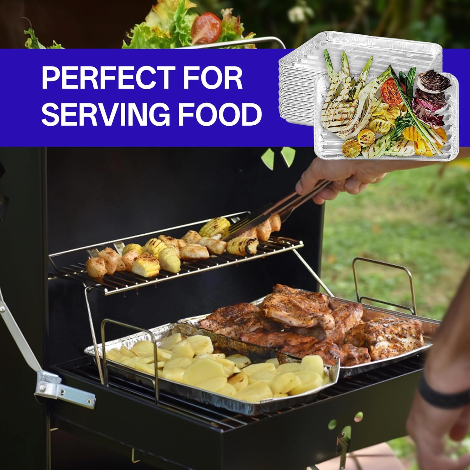 Pack of 50 aluminum broiler pans disposable. Disposable aluminum broiler pans are suitable for most ovens and grills. These foil BBQ grill topper pan are made from thick aluminium that can withstand high temperatures and are suitable for cooking delicious meats and vegetables on the grill and in the oven. Aluminium foil broiler baking pans can bake almost anything without having to worry about food and sauces falling in. These disposable aluminum sheet pans can be used to cook, bake or grill food. Very suitable for making grilled kebabs, meat, fish and vegetables. They can also be used as disposable drip pans in the oven, broiler or grill.Suitable for use as a roasting tray, top of grill, or broiler and oven drip traps. Our disposable broiler oven pans are suitable for indoor, outdoor, and camping use. Specification Quantity: 50 pcs Material: Aluminum foil Color: Silver Shape: Rectangular Size: 13.38 inch X 8.8 inch X 1 inch /22.4 x 34 x 2.7 cm Package includes: 40 x Aluminum Grill Pans Disposable
