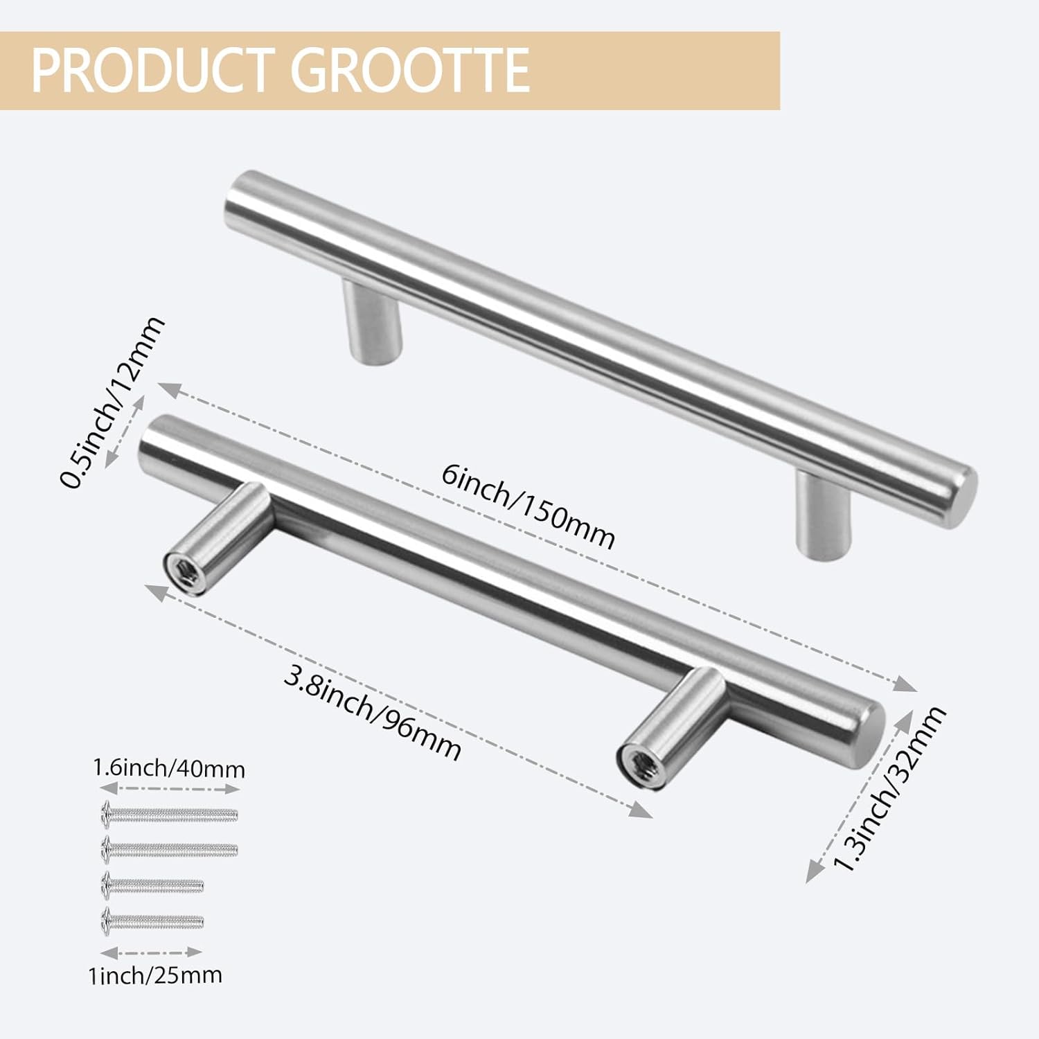 This cabinet handle is a practical and decorative gift for family members, friends, neighbors, colleagues and those who want to creatively decorate their houses, enhancing your relationships. The kitchen handle is made of stainless steel with a brushed surface, is lightweight and not easy to break, providing you with a good user experience. The material of the handle is stainless steel and the color is silver. The size of the handle is as shown in the picture, and the screw sizes are 4mm x 25mm and 4mm x 40mm respectively. You will receive 50 kitchen cabinet handles, 50 pairs of 25mm screws and 50 pairs of 40mm screws. Please note that this handle is not suitable for installation in damp places such as bathrooms, otherwise the surface may rust. Please confirm the size before purchase. Manual measurement, please allow for slight size errors. Due to different screen displays, there may be slight color differences.