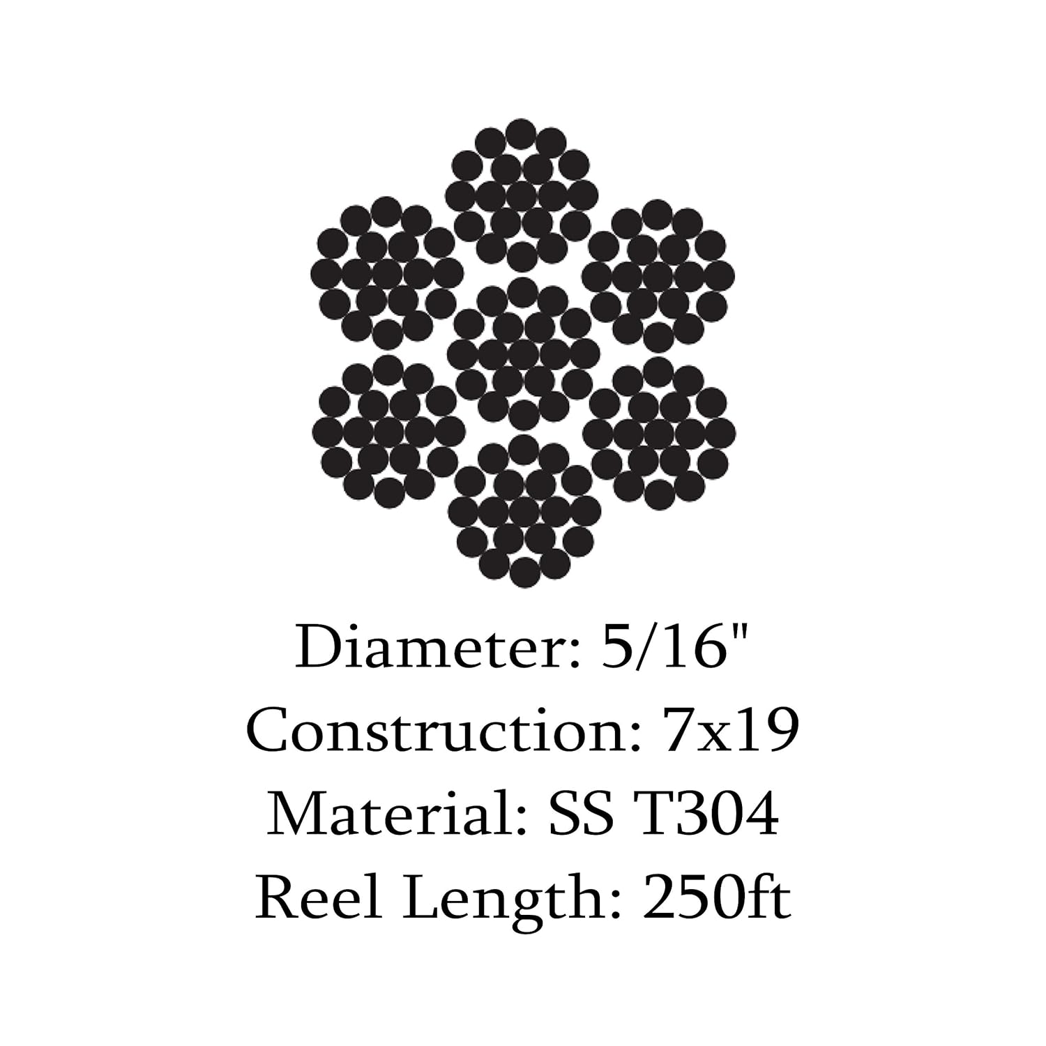 5/16 7x19 Stainless Steel Aircraft Cable 250' Reel. Minimum Break Strength=9,000lbs, Working Load limit=1,800lbs, Imported, Standard: US FS RR-W-410. Commercial Grade: not intended for aircraft use. Warnings: Wire rope & aircraft cable should never be used at breaking strength. 10:1 safety factor minimum is recommended for critical/overhead application. Do not use for overhead lifting without consulting a wire rope rigging professional. End fittings may not hold to 100% of strength efficiency so safety factor such as 5:1 should be divided into the assembly actual strength. A pull test is recommended for quality assurance.