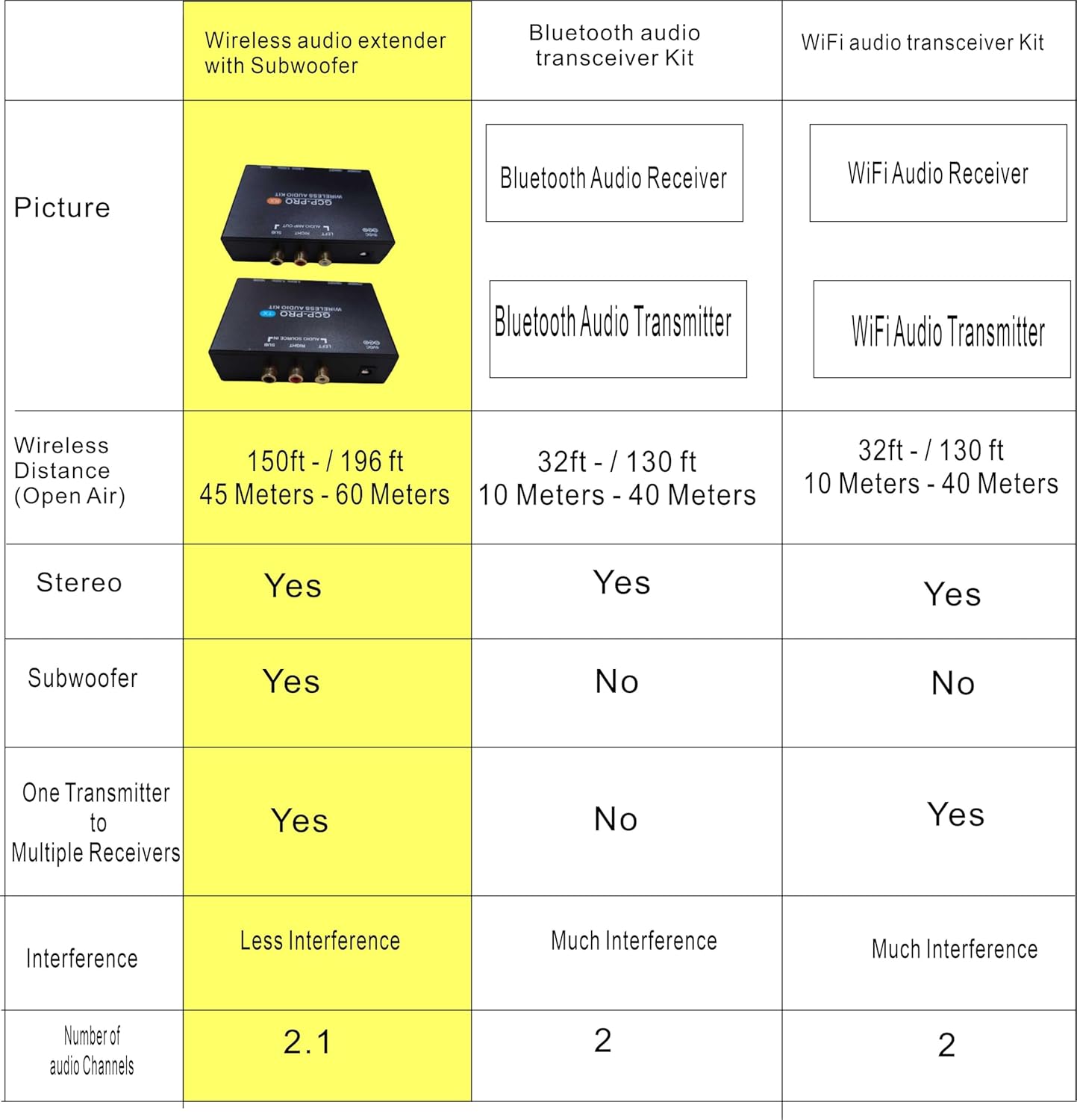 Hate for running cables around doors or hiding under carpet to connect your passive/active subwoofer to the receiver? Or having limited options on passive/active subwoofer or stereo speakers placement due to cable length and component location? GCP-1480 wireless audio extender Kit is absolutely your perfect solution. Because: a. It is designed for the passive or active subwoofers and stereo speakers, which is a excellent device for those that want to start up their home theater sound system with easy setups. b. It provides premium-quality audio for stereo audio applications operating in the 5.2 GHz / 5.8GHz bands, simply connect the transmitter unit to your A/V processor, and the receiver to your passive or active subwoofer and stereo speaker, the wireless connection help eliminate cable. c. Comes with the latest dual band as 5.2 / 5.8GHz wireless technology connection with channels auto selection from RF channel to avoid and decrease possibility of interference from the wireless networks routers, cell phone, garage doors, R/Cs, and other 2.4G/5G WiFi network devices. Great Features: - Easy to set pairing with less than a minute. - Great audio quality: 24-bit @ 48KHz - Almost none audio distortion: <1% - Clear sound: SNR > 80dB - Almost none audio delay: <20ms - Can extent up to 255 receivers wirelessly - Wireless audio extender. - Wireless speaker selector. (Set Rx1 at one RF channel, and Rx2 at another RF channel). - Audio splitter. (Set all the channel are the same on Tx and Rxs). - Amazing wireless distance: --150ft @ open space. Widely application: 1. Home entertainment. 2. Indoor and out door party. 3. Conference. 4. Arena. 5. Church. 6. Hotel. 7. Shopping mall. Trobule shooting: Question 1: Devices have a persistent hum noise (ground loop? noisy board? ) when not playing audio and feeding signal. How to solve? Our answer: Most of the time, "hum noise" always comes from a non-shielding RCA cable. So, we recommend that you can use a shielded RCA cable for the subwoofer. Because shielded RCA cable can shields the audio noise.