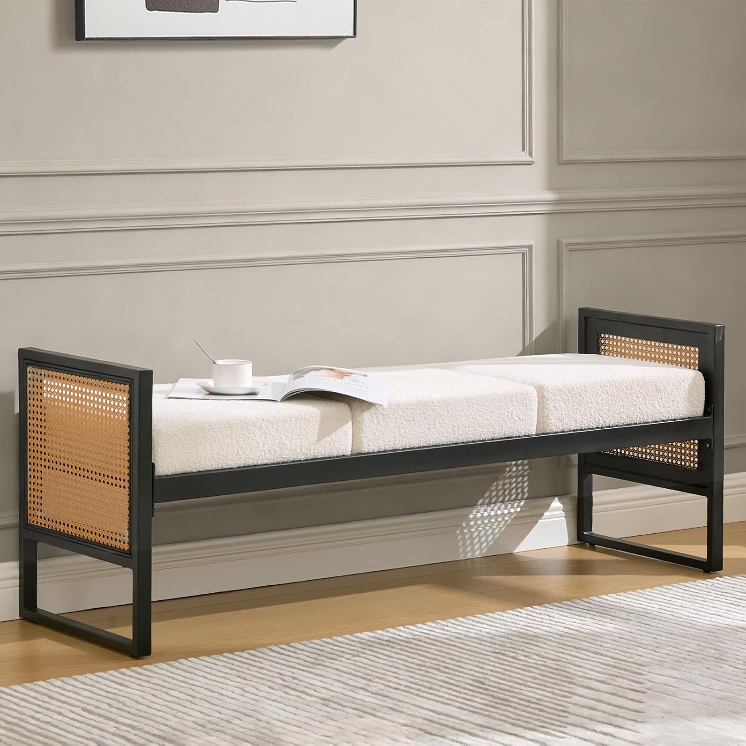 SENNAUX Long Upholstered Boucle Bench with Metal Frame & PE Imitation Rattan Side, Modern Long Entryway Bench for Living Room Bedroom Bench End of Bed - 56.69’’ L x 16.93’’ D x 22.44’’ H Upholstered Entryway Bench Specifications: 1PC End of Bed Bench Weight Capacity: 300 lbs Long Boho Bench Material: PE imitation rattan/Iron frame/Wooden floor/Sponge/Boucle fabric Modern Long Upholstered Bench Seat Colors: Cream, Black, Dark green Bed Bench Dimensions: 56.69''L x 16.93''W x 22.44''H, seat thickness 6.3inches (cushion 4.33inches, iron tube 1.97inches), leg width 56.69inches, leg depth 16.93inches Entryway Upholstered Bench Net Weight: 38.85 lbs