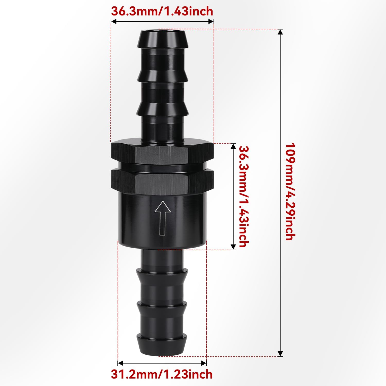 Specifications: Material: 6061-T6 aluminum alloy Barb Size: 5/8inch Color: anodized black Opening Pressure: 1.5 PSI Maximum pressure: 1,500 PSI Features: - These check valves are designed to allow flow in one direction and prevent flow back - Can be used as a non-return valve on a fuel system or as a one-way breather valve on fuel tanks - Compatible with fuels, oil, coolant, air, diesel, methanol, ethanol, E85 Notice: Professional installation is highly recommended! (No instructions included)
