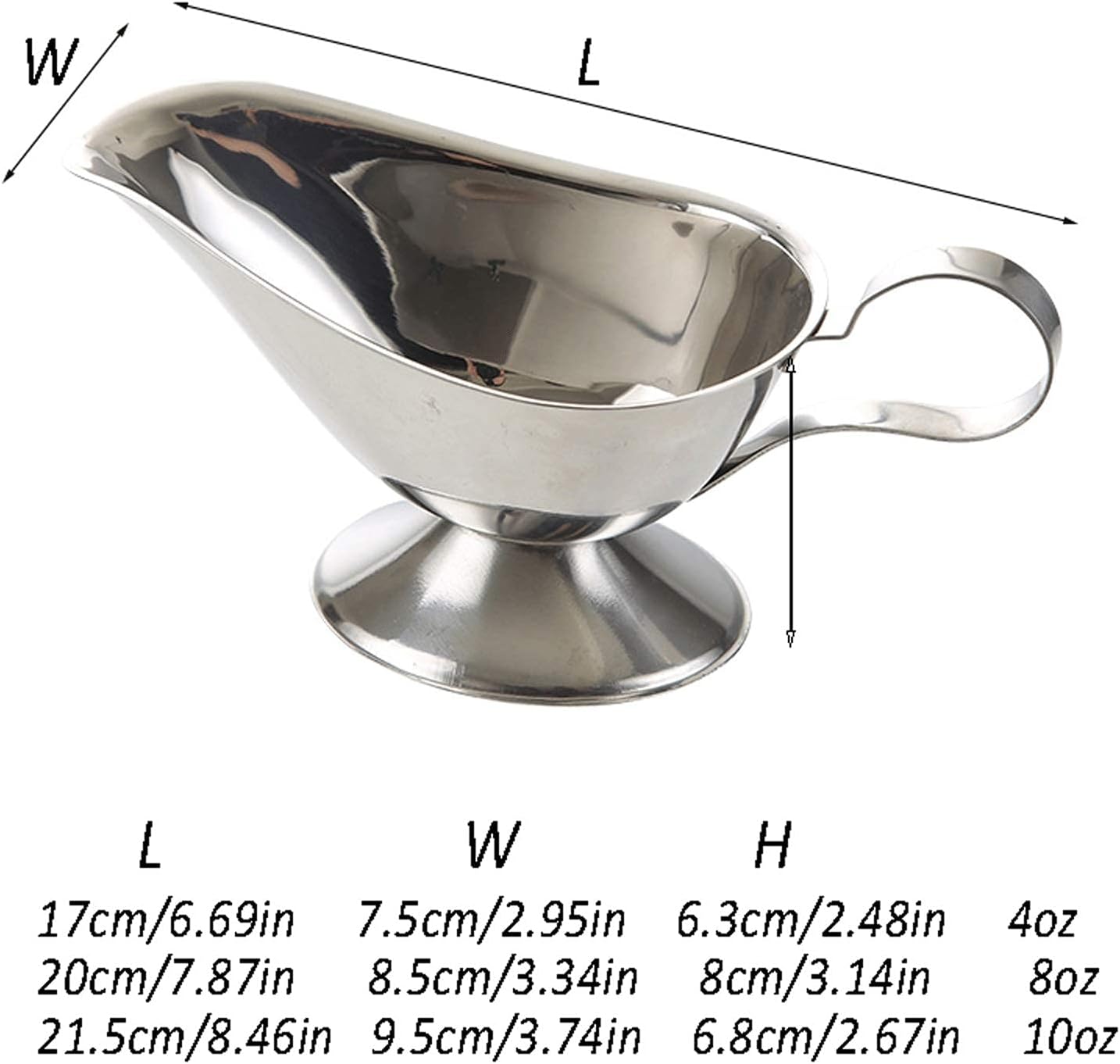 Product name:Gravy boat product material:stainless steel Product ounce: 5Oz/8.1Oz/10Oz Product package:One piece Prompt: 1.Please check the color and the size of the product before buying 2. Our shop does not include other items except the Gravy boat shown in the product photo 3. Please note that due to different monitors, there may be slight color difference, please understand. 4. Due to manual measurement, there will be a small amount of error. Please refer to the actual size. Thank you!