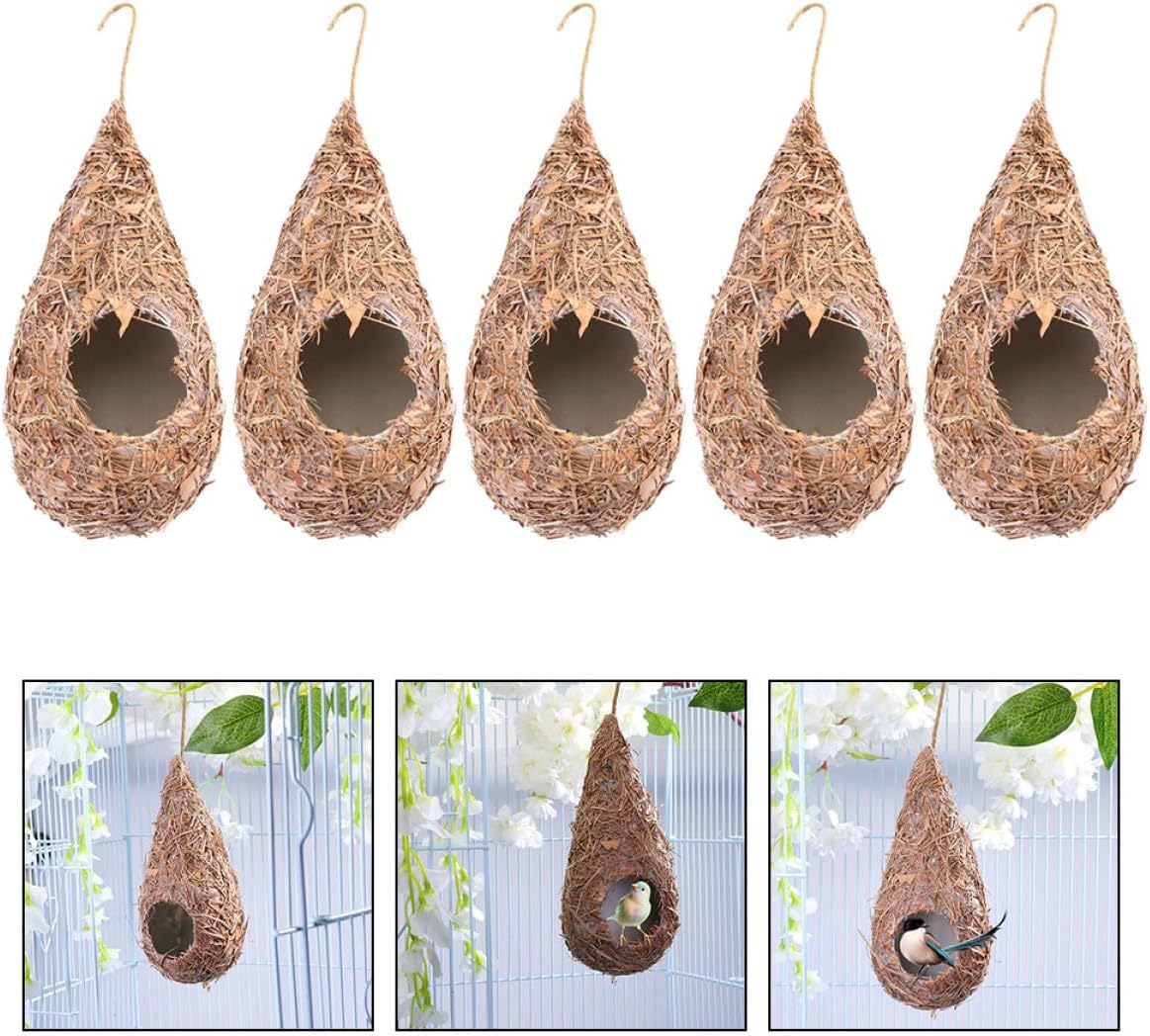 Package Include 5 nests Characteristics -Material: Straw, plastic -Color:Khaki -Product Info:Grass-woven simulated bird nest -Size: About 23.00X7.00X8.00cm/9.04X2.75X3.14inch -It is the perfect place for your little birds to breed and relax, also can be a straw woven decor hand woven bird nest. -The hanging bird house made of good material, sturdy, strong and durable. -The straw nest will be a wonderful present for any bird lovers or people who loves nature woven straw bird nests. -With the strong rope, you can suspend the birdhouse on tree branches, vines or fences Woven Bird House. -This birdhouse can provide a sheltered for birds from cold biting winds, rain and snow outdoor hanging bird nests.Goods Descriptionspherical bird nests If you just want to decorate your room, you can buy some beautiful flowers and put it on this birdhouse, will bring a fresh and natural feeling.woven bird hut Do you want to find a warm house for your lovely bird? This multi-functional product is suitable for decorating the indoor, outdoor and keeping a bird