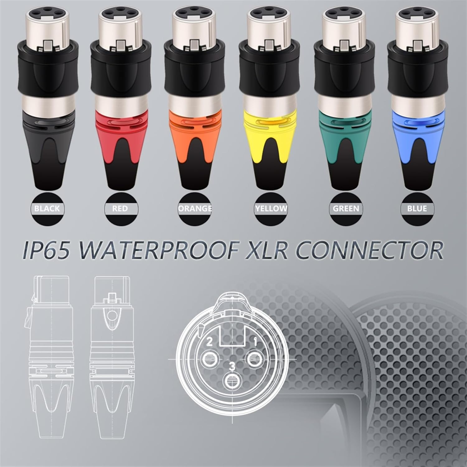 Miniature Cylindrical Connectors5Sets Outdoor XLR 3Pin Male&Female Audio Mic Connector Mounting Panel Black/Silver ShellItem Name 3 Pin XLR ConnectorGender: Male/Female12 Colors: Black Shell + Yellow Tail,Black Shell + Green Tail,Black Shell + Orange Tail,Black Shell + Red Tail,Black Shell + Blue Tail,Black Shell + Black Tail,Silver Shell + Yellow Tail,Silver Shell + Green Tail,Silver Shell + Orange Tail,Silver Shell + Red Tail,Silver Shell + Blue Tail,Silver Shell + Black Tail,Package Included: 5sets (5Male +5Female)