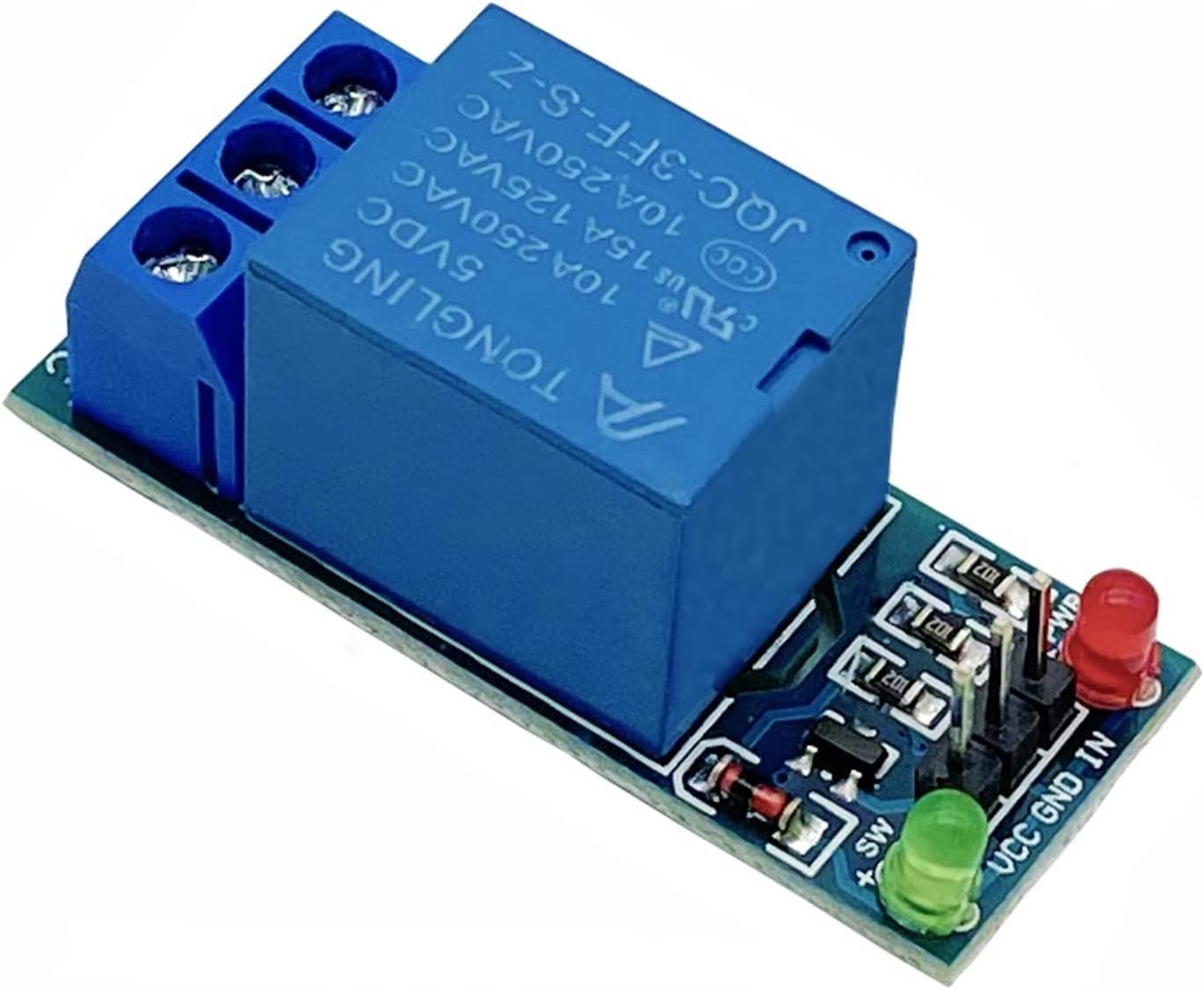 relayModule Parameters:There are 4 fixing screw holes around the board, the hole diameter is 3.1mm, which is convenient for installation and fixing.The relay uses high quality Songle relay, single pole double throw. a common end, a normally open end, and a normally closed endOptocoupler isolation, good anti-interferenceLow level pull-in, high level release. The status indicator is on when the inverter is closed, and the status indicator is off when released.VCC is the system power supply, and JD_VCC is the relay power supply. Plug in the jumper capElectrical parameters:Supply voltage: 5VDC/12VDC/24VDCCurrent: greater than 100mALoad: 250V 10A AC or 30V 10A DC