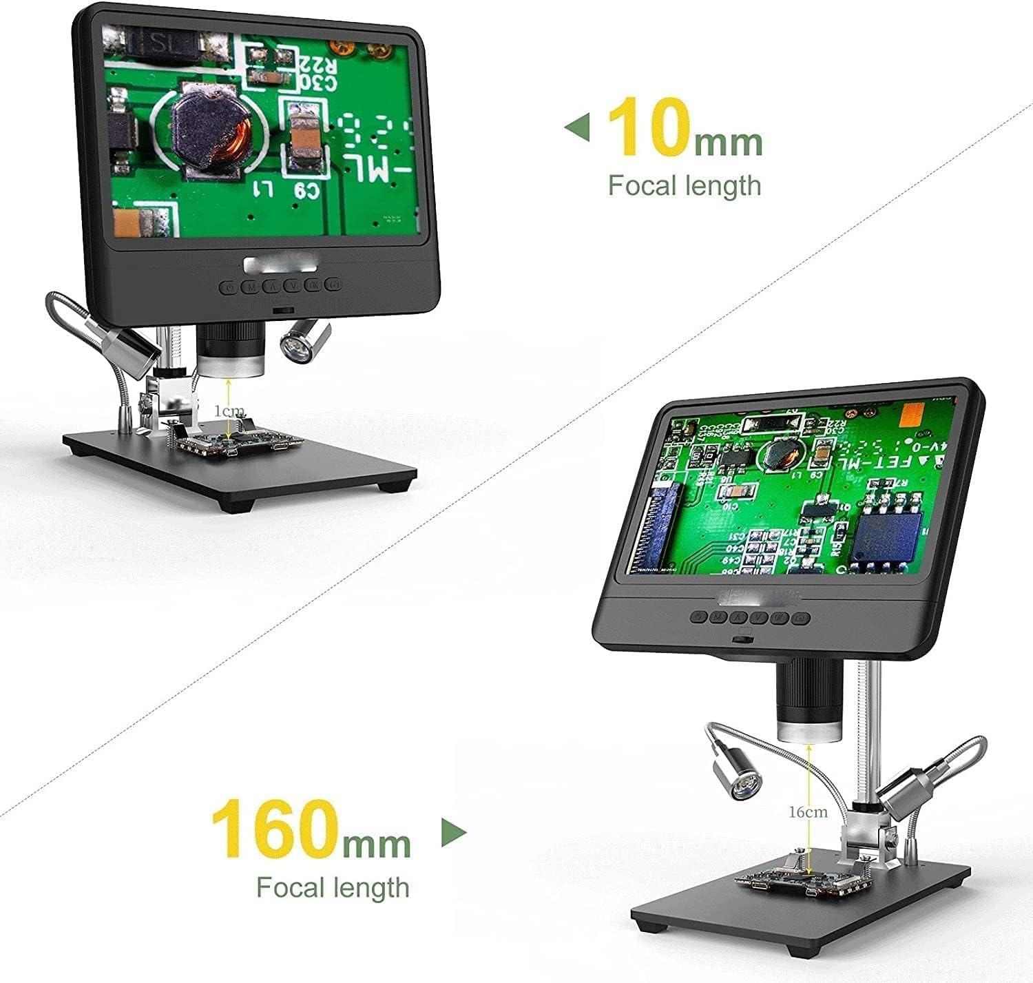 The product has an 8.5 inch LCD screen, which is larger and displays clearer. The angle of the microscope display can be adjusted to facilitate multi-angle observation. The metal bracket can be adjusted front and rear, which can bring 3D visual effects and larger operating space. The metal black base plate, with a clip, can fix the observation item. 2 LED lights were added to the bracket base, with 8 LED lights built in, make the im-age sharper. Supports memory card recording and taking pictures, which is more to use. Products are widely used: re-pair of electronic products such as mobile phones and computers, anti-que identification, printed matter, textiles, jewelry, factory production lines, bid re-pairs, plant and in-sect observation, etc. There are two types to choose from. The first type has no battery and needs to be connected to the data line; the second type has built-in lithium battery. You can choose the one you want. Specifications: Material: ABS+metal. Type: Type1, Type2(optional). Image sensor: 2 pixels high definition sensor. Video format: AVI. Magnification: 5X-1200X. Photo resolution: max 12 m (4032 x 3024). Picture format: JPG Focus range: 10 mm-160 mm. Frame rate: max 30f/s Storage: Micro SD card, up to 32G (not included). PC support: no. Power source: USB direct current 5 V. Battery: 1 x lithium battery, 2200 mAh. View size: 8.5 inches Screen resolution: 1280 x 800. Stand size: 200 x 190 x 120 mm/7.9 x 7.5 x 4.7 inches. Package size: 295 x 260 x 145 mm/11.6 x 10.2 x 5.7 inches. Package weight: 1650 g/3.6 lb. Service philosophy: Welcome to my shop! We are confident to provide you with quality products, please rest assured to buy, if you have any questions, please feel free to contact us