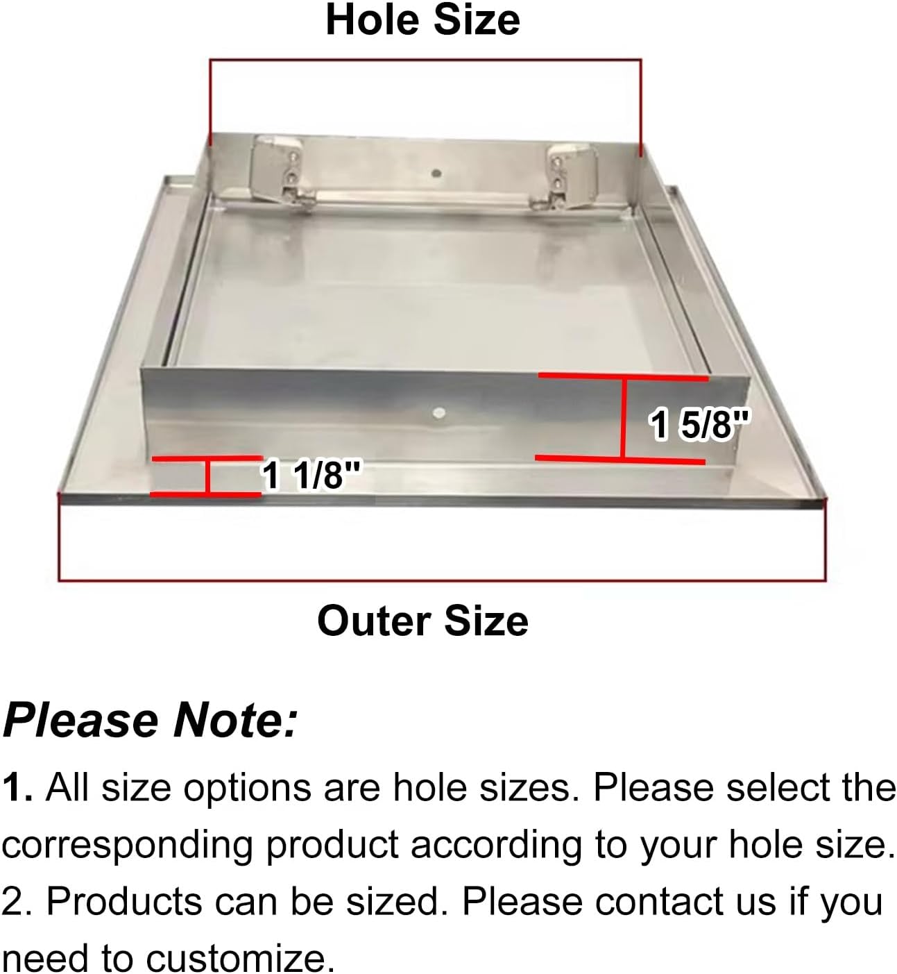 Our access door panels provide an aesthetically pleasing solution for hiding cables or unsightly openings in drywall, water valves, and all types of renovation projects.Specification:- Material: Stainless Steel - Frame Width: 1 1/8"- Width X Height: Can be CustomizedFeatures:- Flush with the wall after installation- Good load-bearing capacity, sturdy and durable for long-term use- Easily opening and closing with a key- Good fire resistance, suitable for public spaces and residences- Customized sizes are available to fit different access openings- Convenient access and maintenance for easy servicing- Excellent sealing performance, magnetic design ensures tight closurePackage Includes:- 1 x Access Panel- KeysPlease Note:- Please select the appropriate size to get the desired service space, - Please allow a slight dimension difference due to different manual measurements.- Due to the light and screen setting differences, the item's color may be slightly different from the pictures.